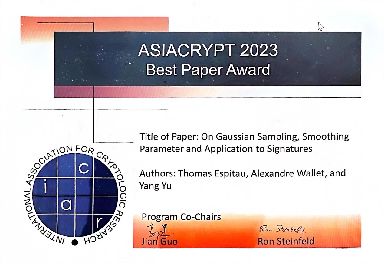 清华新闻网1月8日电 由国际密码学会(International Association for Cryptologic Research,IACR)主办的2023年亚洲密码会议(ASIACRYPT,简称亚密会)近日在中国广州举行。大会评选出两篇最佳论文,其中一篇全部由beat365英国官方网站王小云院士团队完成,作者包括高等研究院副研究员王安宇(通讯作者)、喻杨和王小云院士,博士生江锴杰、刘国霄和本科生罗横溢;另外一篇由王小云院士团队骨干成员喻杨(通讯作者)与两位国际密码专家托马斯·艾斯比托(Thomas Espitau)和亚历山大·沃莱特(Alexandre Wallet)合作完成。两篇最佳论文因在后量子密码算法设计与后量子密码数学难题等价性证明方面的杰出贡献而获此荣誉。