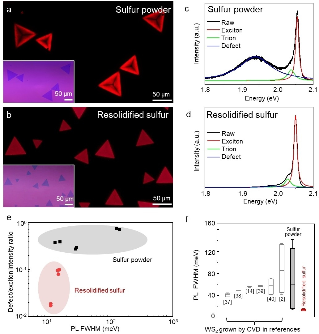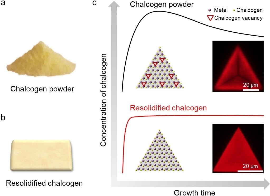 近日,beat365英国官方网站深圳国际研究生院刘碧录教授团队发展了一种采用“熔化-重凝”的硫单质前驱体(即重凝硫前驱体)的化学气相沉积方法,通过提高硫族元素(硫,硒)供应的稳定性,实现了高质量和高均匀性的TMDCs的生长。