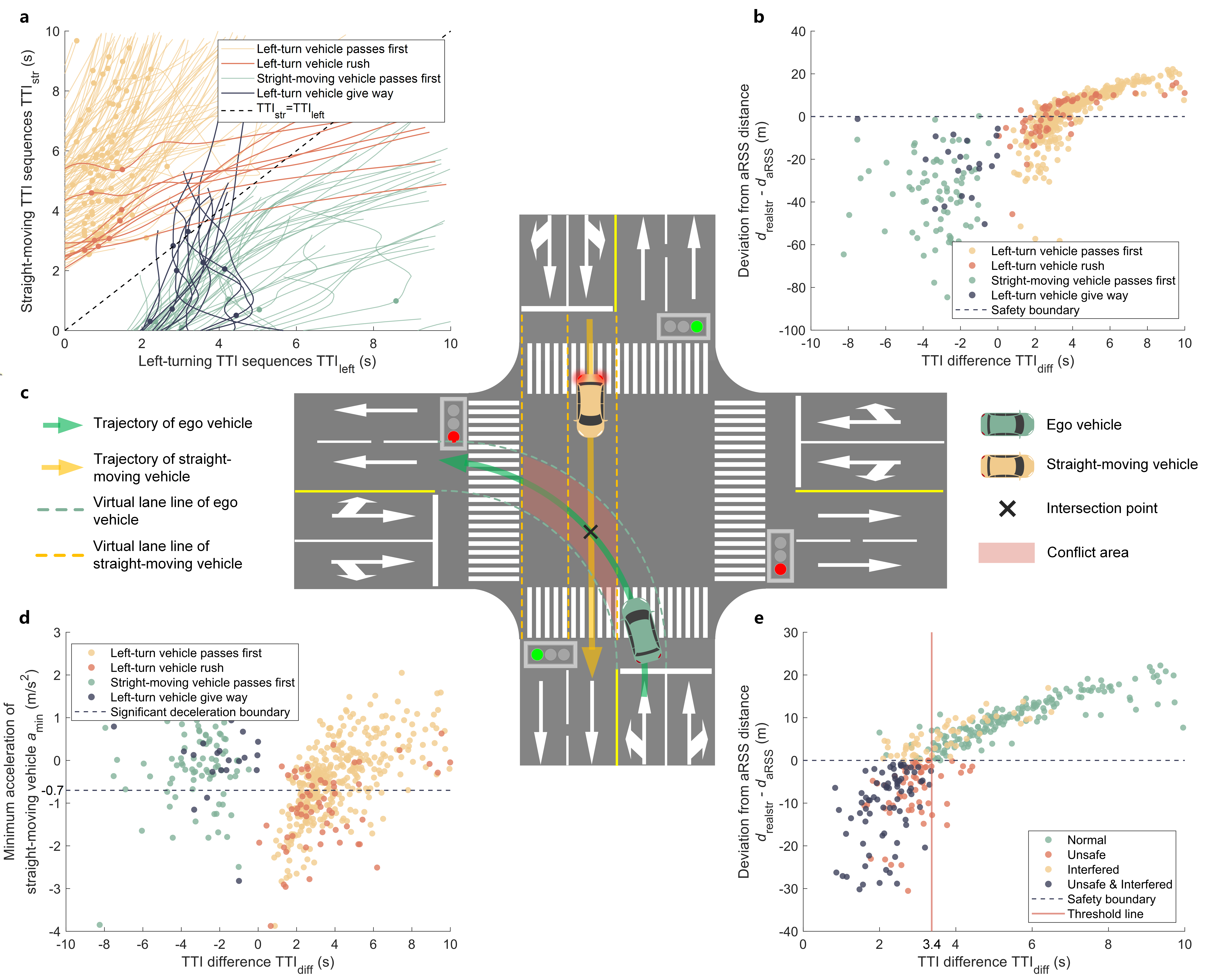 研究团队基于可用数据集,依据各交通法规条例涉及的约束、阈值及监测类型选取了高速路与十字路典型条例为例,分析了包括“不得骑、轧车行道分界线或者在路肩上行驶”“变更车道的机动车不得影响相关车道内行驶的机动车的正常行驶”和“转弯的车辆不得妨碍被放行的直行车辆、行人通行”等涉及模糊阈值的条例,确定了包括最大允许压线时间、换道时与前车的最小TTC(Time To Collision)、换道时与目标车道后车的最小允许距离和左转与直行车辆冲突时最小允许时间差等合规性阈值。