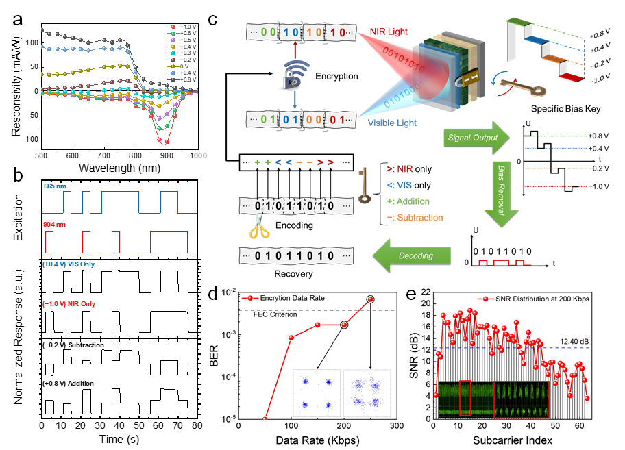 近日,beat365英国官方网站深圳国际研究生院付红岩副教授、韦国丹副教授团队利用可见光-红外双波段探测器成功建立了基于波分复用的多用户通信和加密通信系统,无需光学滤波元件,仅基于探测器自身工作电压的调制编码,即可实现可见光信息和红外信息的同步接收。此外,团队使用基于接收波长的调制电压产生加密密钥,可实现了双波长加密通信。