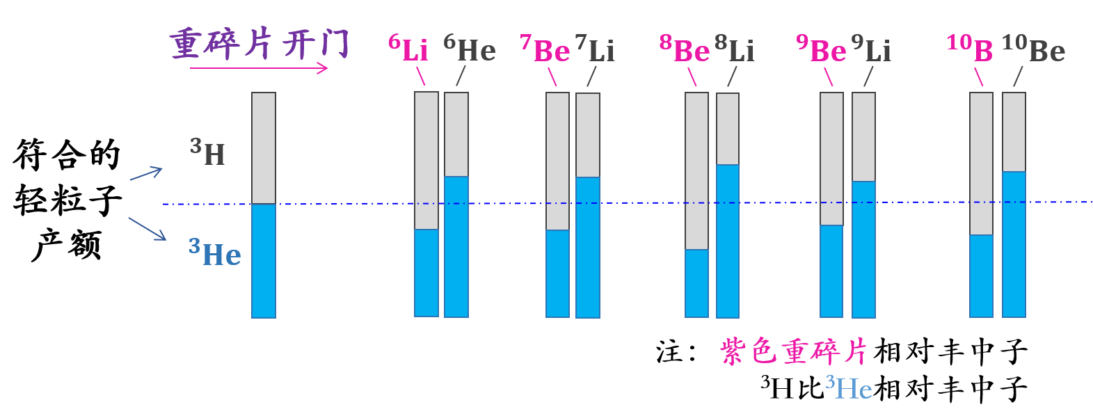 第二幕《偏在微纳做“道场”》:该片段主要讲述在重离子电光火石般的碰撞过程中,丰中子粒子和缺中子粒子以“乒乓”模式交替出射的故事。在“看到”粒子的“出场顺序”后,团队进一步提出,一次核反应中先后出射的两个“演员”粒子间的中子丰度是否存在显著联系。通过分析每次碰撞中与中等质量碎片符合出射的氚和氦-3的能谱和产额比,他们发现,虽然氚和氦-3的能谱呈现出标度现象,但它们的产额比与关联中等质量碎片的中质比呈现显著的反关联。也就是说,如果先出射的碎片相对丰中子,则伴随出射的轻粒子相对缺中子,反之亦然,呈现一种有趣的“乒乓”模式。这一幕记录了核反应中“演员”(粒子)的出射模式,为研究核碰撞动力学与核子结团出射性质提供了新思路,相关结果于2023年在PhysicalReview C上发表[PhysicalReview C, 107, L041601 (2023)]。