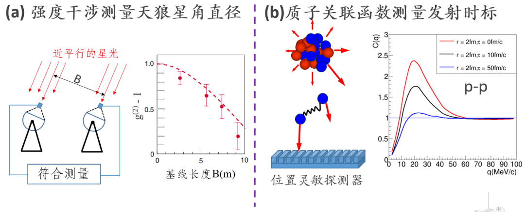 “电影”需要精确到仄秒(十万亿亿分之一秒,即秒)量级,除了拥有CSHINE探测系统这台超级“摄像机”之外,还需要用到非常精确的“拍摄脚本”——HBT强度干涉测量技术(HBT是Hanbury Brown和Twiss两位科学家的姓氏缩写),在核物理中也称为小角关联函数方法。最初HBT通过两个相互靠近的望远镜,记录天狼星光信号强度的符合信息,得到天狼星的角直径。后来人们将此方法拓展到核物理中,通过测量小相对角度内两个符合粒子的动量关联信息,得到核反应过程中碰撞区域的时间和空间的演化特性。