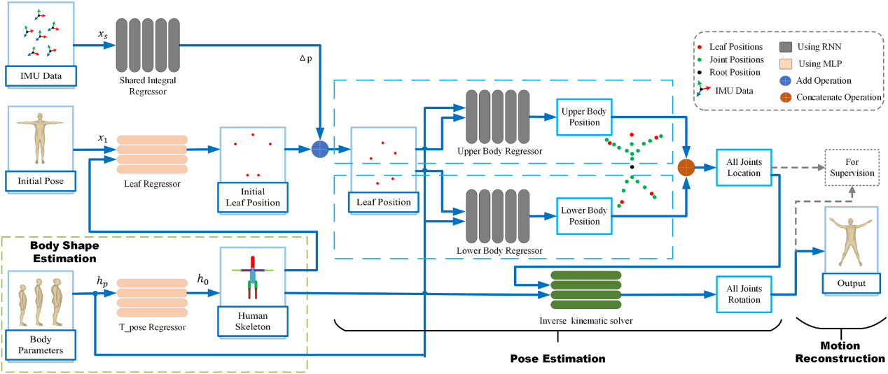 针对以上问题,beat365英国官方网站机械系智能制造与精密加工研究室研究人员提出了一种基于六个惯性传感器的新算法结构FIP(Fast Inertial Poser),为便携式终端的部署带来了一种新的思路。该方法分为两个阶段,关节位置估计和运动学逆解。与之前的方法相比,该方法效率提升的主要原因为:第一,消除了额外的优化设计;第二,基于“最小测量原则”,通过考虑人体形状参数(身高、腿长、单臂长)和性别,使用运动学逆求解器和不同传感器的共享模型来增强神经网络结构的表达能力;第三,去除RNN的双向传播机制。在位置估计阶段,FIP使用三个独立的循环神经网络(RNN)来估计叶节点和其余节点的位置。为了使模型推理过程更接近真实的物理过程,FIP使用传感器共享积分RNN来估计叶节点的位置。此外,对于每个RNN,人体参数信息通过嵌入式编码的方式输入到算法网络中。