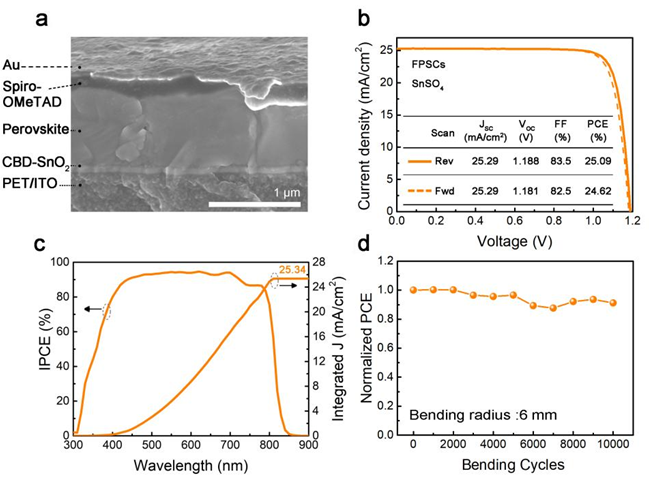 图3.柔性钙钛矿电池截面SEM图和性能测试结果