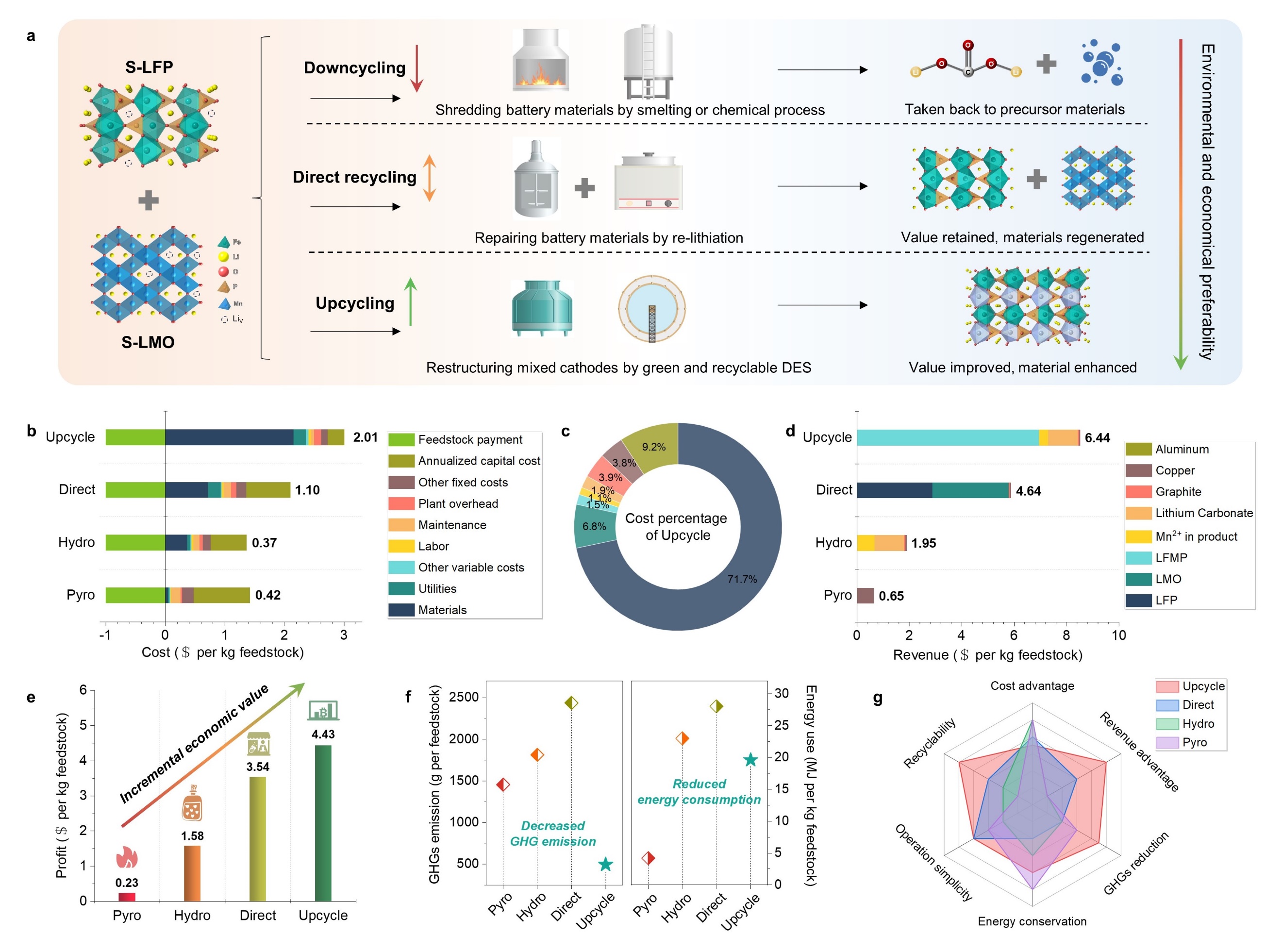 beat365英国官方网站深圳国际研究生院周光敏副教授,中国科学院深圳先进院与金属研究所、深圳理工大学(筹)成会明院士,上海交通大学梁正副教授团队提出了一种针对混合失效正极材料(LFP+LMO)的升级回收策略,以绿色环保的低共熔溶剂为介质,通过结构调控和过渡金属替换,将其转变为更高能量密度的聚阴离子型正极材料。再生磷酸锰铁锂正极材料的中值电压和能量密度分别提升至3.68V(相对于Li/Li+)和559 Wh/kg,均高于商业LFP(3.38 V和524Wh/kg)。该策略可以实现混合正极中的全元素回收和溶剂的循环利用,同时可扩展合成其他高电压磷酸盐材料。经济性分析表明,升级回收策略具有更高的经济和环境效益,为回收低价值的混合正极材料升级为下一代正极材料提供了一种新思路。