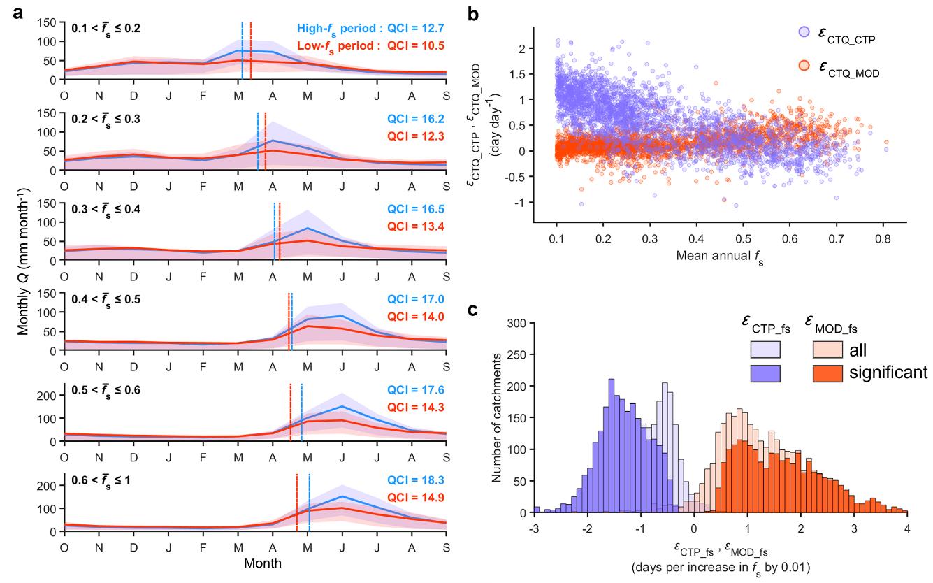 研究基于北半球3000余个受降雪影响流域的长期(1950-2020)水文气象观测资料分析发现,冬季降雪减少导致春季融雪时间普遍提前、降水质心时间推后。由于不同流域径流发生时间对融雪和降水的敏感性存在差异,在降雪比例较高的流域,冬季降雪减少导致径流提前;而在降雪比例较低的流域,冬季降雪减少导致径流推后。上述两种相反的变化趋势存在一个降雪比例阈值,即多年平均降雪比例约为40%,该阈值对应的平均海拔高度约为1500米。研究还发现降雪减少导致暖季径流和年径流峰值显著下降,从而降低了径流的季节变异性。同时,降雪减少增强了径流的季节变异性与径流质心发生时间在年际间的波动。该研究系统揭示了气候变暖背景下融雪径流响应规律,改写了“降雪减少、融雪提前、径流提前”的传统认知,为全球升温背景下降雪减少对径流过程的影响提供了新的机理认识。