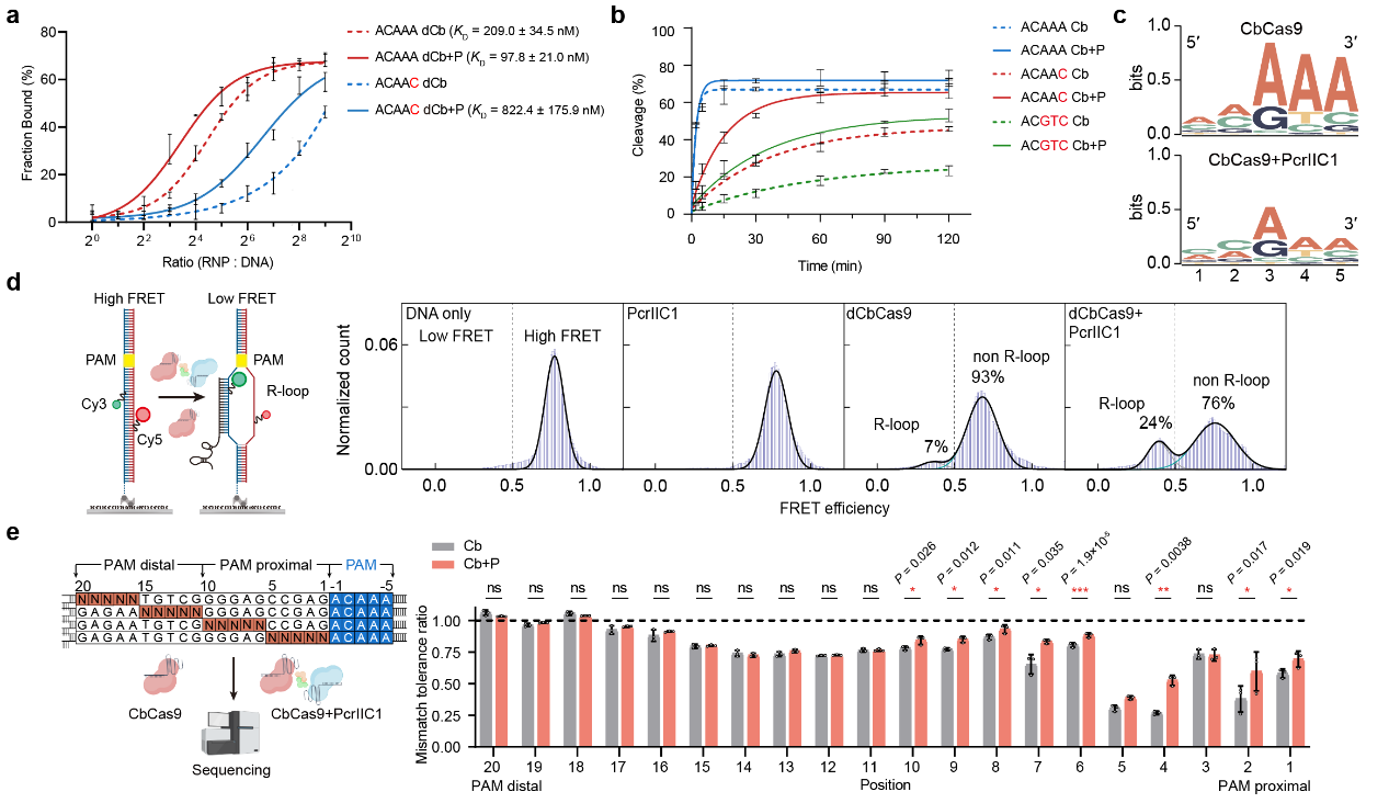 图3.PcrIIC1增强CbCas9的DNA结合(a)、切割(b)、PAM兼容性(c)、DNA解旋(d)和错配容忍(e)能力