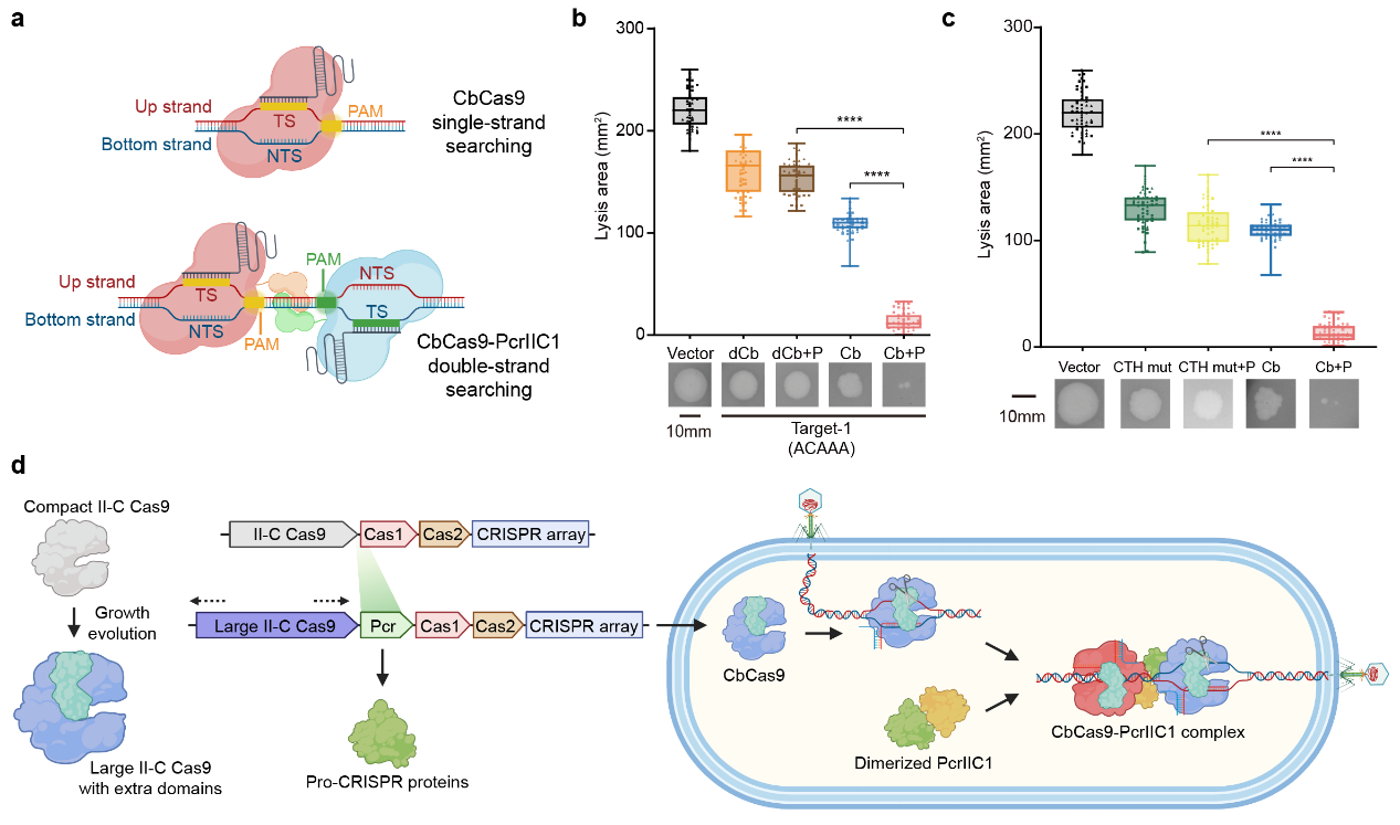 最终,为了检验CRISPR免疫增效子PcrIIC1对CbCas9抗噬菌体免疫能力的影响,研究人员在大肠杆菌中进行了抗噬菌体实验。实验结果表明PcrIIC1显著提升CbCas9系统对噬菌体的抵抗,且如果破坏CbCas9与PcrIIC1的相互作用,会导致增强的免疫力丧失。以上结果说明CbCas9-PcrIIC1复合体的形成对整个CRISPR-Cas系统的免疫增强至关重要。