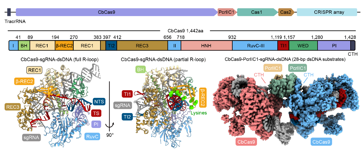 图2.CbCas9基因簇构成(上)、CbCas9效应蛋白结构(左下)和CbCas9-PcrIIC1复合体结构(右下)