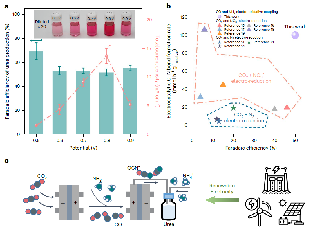 图2.(a)铂碳催化剂在氧化偶联反应中的选择性和反应电流;(b)研究团队与过去实验结果在电化学碳氮偶联速率以及选择性方面的比较;(c)研究团队提出的串联反应制备尿素的反应路径