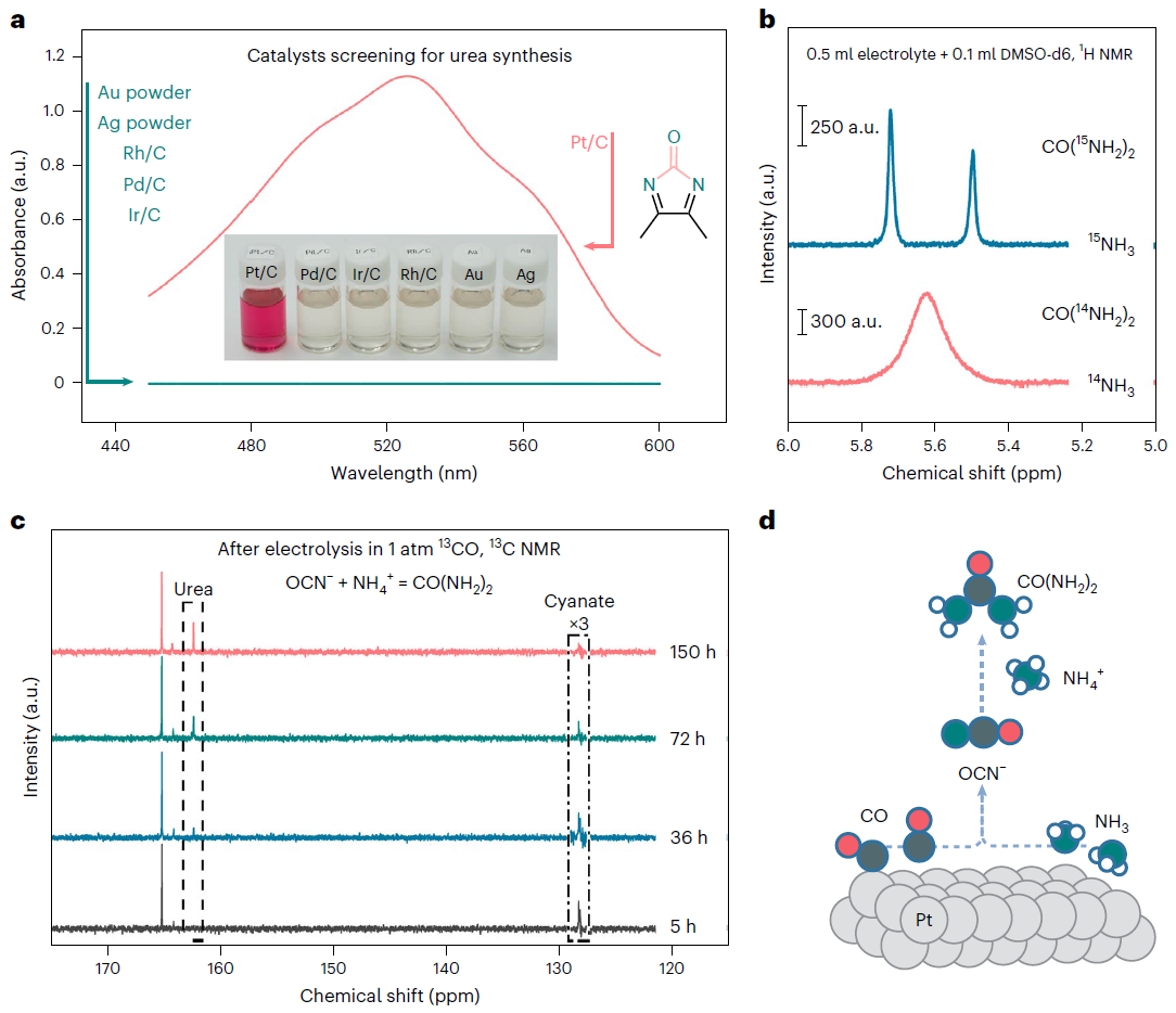 图1.(a)不同贵金属催化剂反应后的电解液对于尿素染料的响应情况;(b)使用氮同位素标记的氨和(c)碳同位素标记的一氧化碳的核磁表征;(d)电化学氧化偶联生成尿素的反应路径图