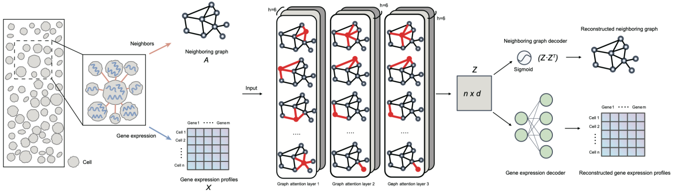 清华新闻网6月17日电 在多细胞生物体中,尽管所有细胞共享相同的基因组,但由于内部基因调控网络的差异以及与周围微环境中相邻细胞的外部信号交流,它们在形态、基因表达和功能上展现出显著的多样性。相邻的不同种类细胞之间再通过复杂的相互作用,形成一定功能的组织模块。近年来,随着空间转录组技术的不断发展,研究者能够在单细胞分辨率下获得细胞的基因表达谱,同时保留细胞在组织内的空间位置信息。因此,如何有效地利用这些空间位置信息来揭示复杂组织中细胞的空间排列模式和相关的生物学功能,即识别空间细胞亚型和发现组织模块,是空间转录组数据分析的核心任务。