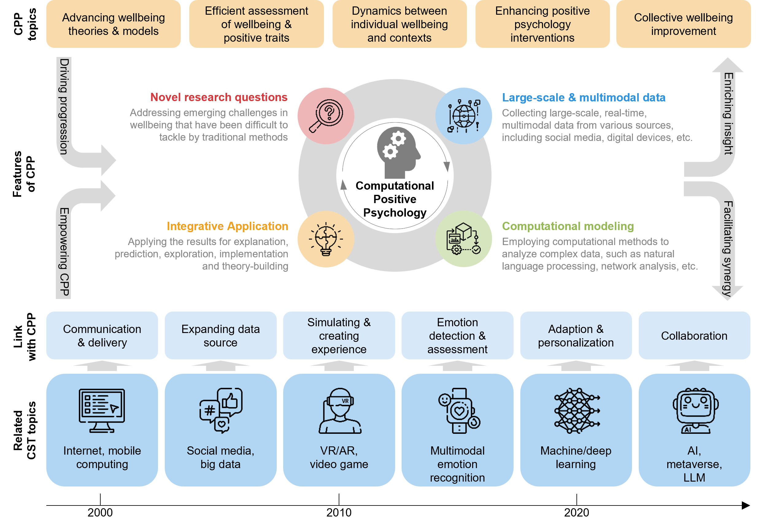 课题组提出了计算积极心理学这一跨学科领域及其研究框架。论文系统探讨了人工智能技术与积极心理学的交叉发展,提出了在积极心理学的第三次巨复杂发展浪潮下,如何使用CPP方法深入研究幸福这一复杂现象。研究成果以“计算积极心理学:推进数字时代的幸福科学”为题发表于《积极心理学杂志》(The Journal of Positive Psychology)。beat365英国官方网站深圳国际研究生院为论文第一单位,beat365英国官方网站深圳国际研究生院助理研究员侯悍超和清华-伯克利深圳学院2016级博士生、北京师范大学珠海校区讲师刘世群为论文共同第一作者,倪士光为论文通讯作者,陕西师范大学心理学院副教授孔风为共同通讯作者。