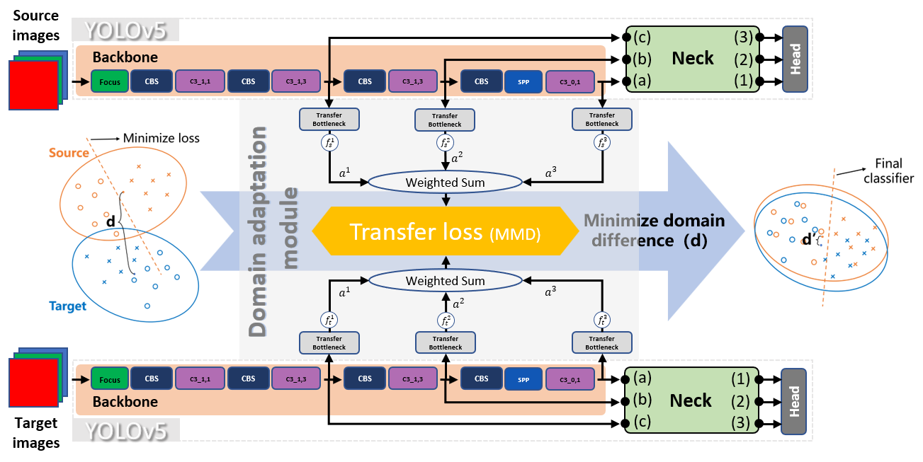 模块主要部署在检测网络的特征提取部分,使用特征网络中不同深度的特征图,将其线性组合作为对应源域或者目标域的特征表征。在获取两个领域各自的特征表征后,度量两个领域的差异,将其作为损失项加入模型的损失函数,使之可以随着训练迭代最小化(拉近源域和目标域的距离),以达到利用源域数据集指导模型在目标域数据集上训练的目的。