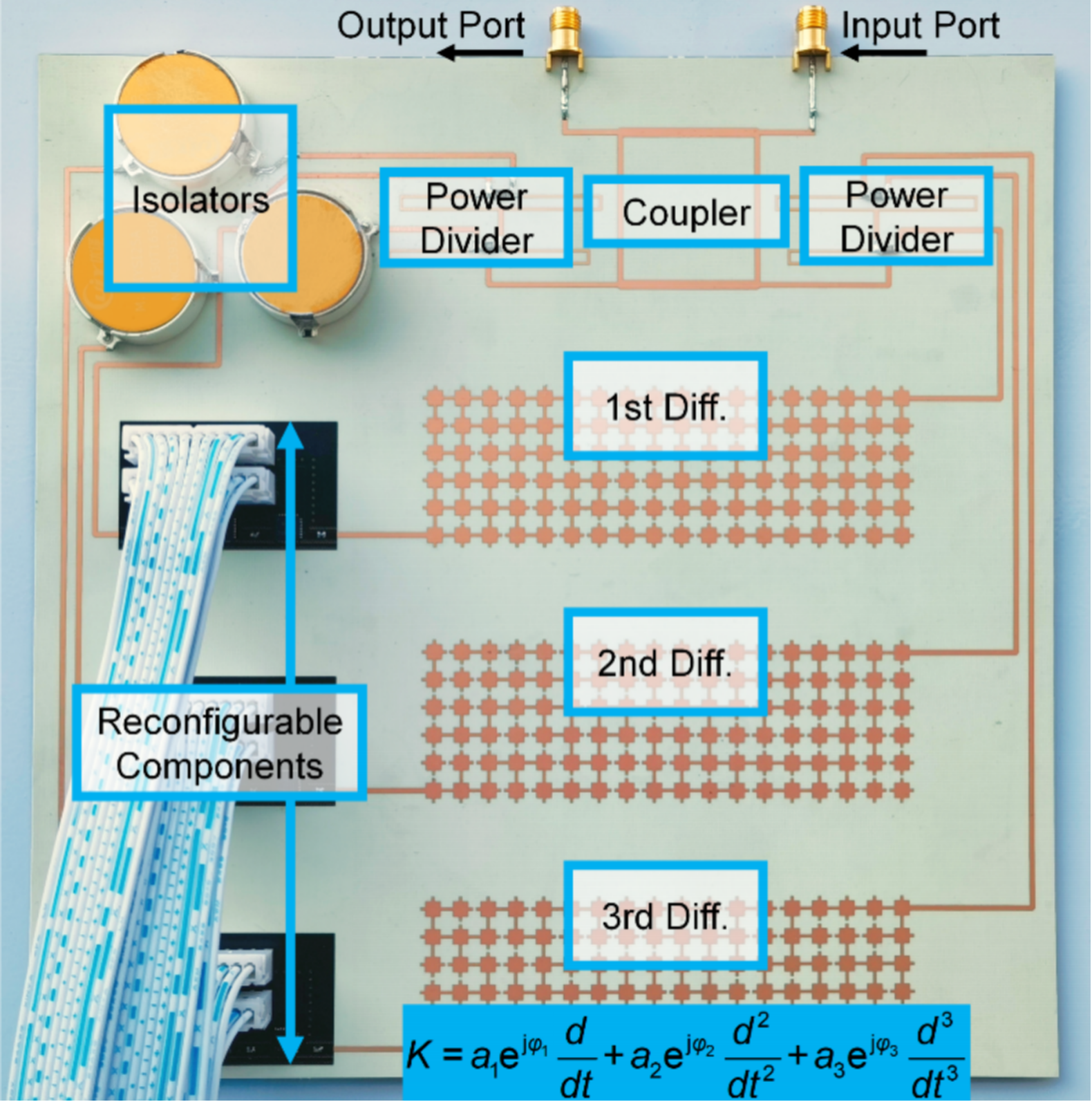 微积分方程的应用几乎涵盖了所有科学领域,例如天文学中的天体运动、生物学中的种群增长以及电磁学中的麦克斯韦方程等。精确而快速地求解微积分方程可以帮助人们理解系统的变化规律,并预测其发展趋势。传统的微积分方程求解往往采用基于数字电路的数值分析方法。近年来,由于其高速率、大带宽、高并行度的优势,以电磁波为信息载体的模拟计算系统被广泛研究,为快速精确求解微积分方程提供了新思路。例如:宾夕法尼亚大学研究团队利用芝士形状的介质结构实现了特定积分方程的求解;瑞士联邦理工学院研究团队利用特定结构的拓扑特性成功求解了线性微分方程;而阿姆斯特丹大学研究团队基于周期排布的超表面在单元自由空间中实现了积分方程的求解。然而,现有的用于求解微积分方程的模拟计算系统仍然面临尺寸大、集成度差和可重构实现等诸多挑战。