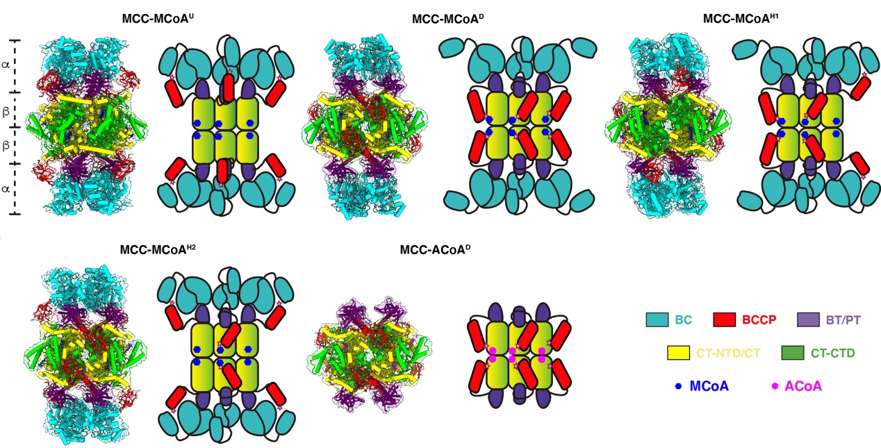 清华新闻网9月6日电 生物素依赖型羧化酶对涉及羧基转移的各种代谢过程至关重要,它们在糖异生、脂肪酸合成和氨基酸分解代谢中起着至关重要的作用。该酶家族在人体中包括乙酰辅酶A羧化酶ACC——脂肪酸合成的关键,丙酮酸羧化酶PC——对糖异生、脂肪合成至关重要,丙酰辅酶A羧化酶PCC——参与某些氨基酸和奇数链脂肪酸的代谢;以及3-甲基巴豆酰辅酶A羧化酶MCC——负责亮氨酸分解代谢。基因突变造成的这些酶的缺乏或功能缺失可导致严重的代谢紊乱,如丙酸血症和多种羧化酶缺乏症,其特征是无法代谢某些脂肪和蛋白质,积累有毒中间产物。因此,研究人源生物素依赖型羧化酶可以深入了解它们所控制的生化途径,为开发相关代谢疾病的治疗提供新的思路。