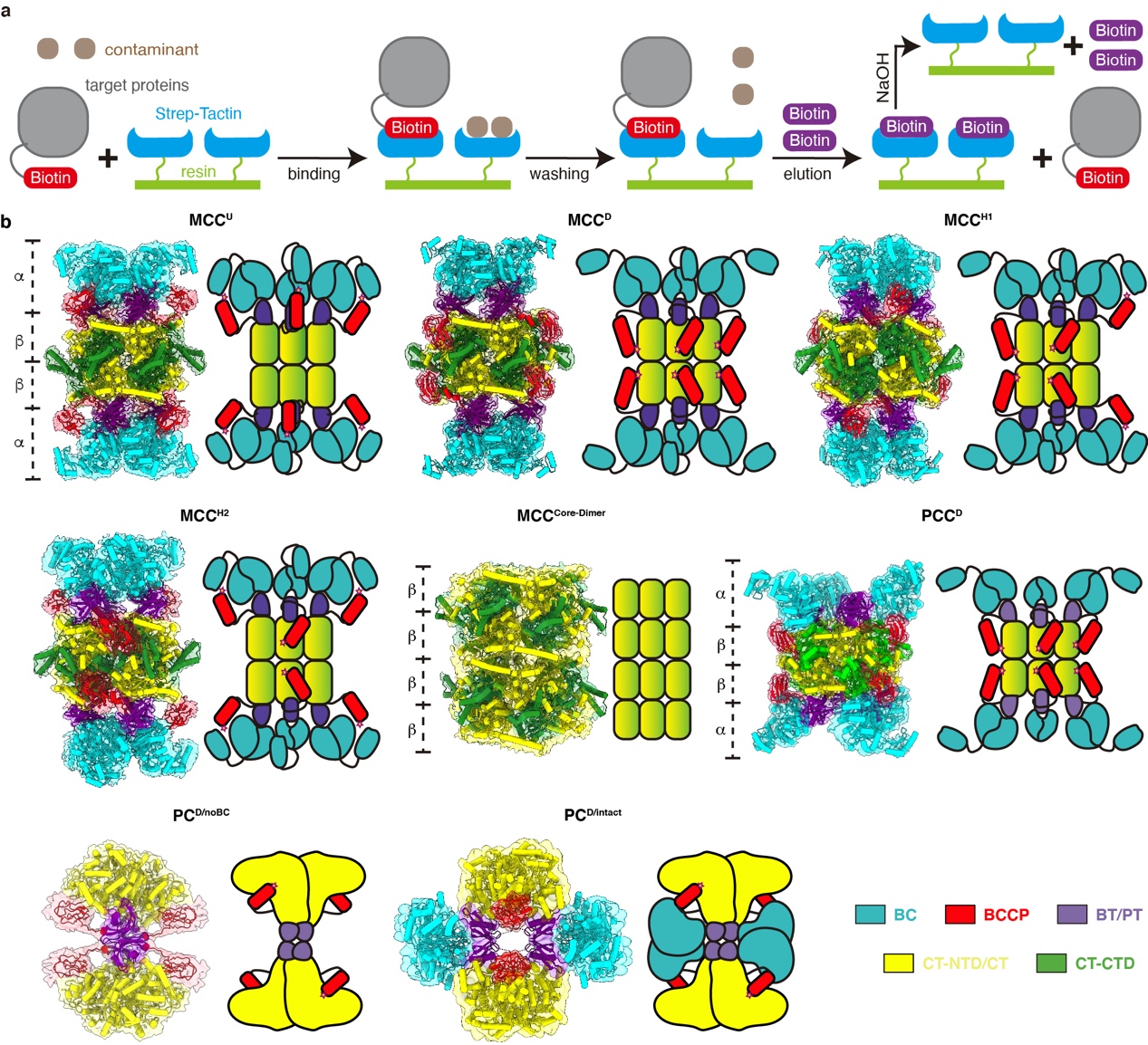 图1.a.内源生物素依赖型羧化酶纯化流程。b.多种构象的MCC、PCC、PC的原子模型(叠加电镜密度图)和结构模型