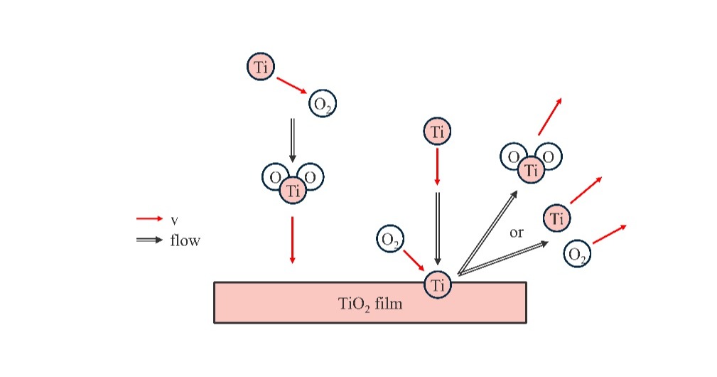 在TiO2薄膜沉积过程中,磁控溅射技术被用来制备薄膜。通过将真空腔抽至低压并注入Ar气体,Ar原子在正负电极的电压作用下被电离为Ar⁺离子和自由电子。电子迅速移动到玻璃基板,而带正电的Ar⁺离子则加速并撞击靶材(Ti靶)。这些高速碰撞使Ti原子获得足够的能量,从靶材中释放出来,并与腔内的O2发生化学反应生成TiO2薄膜。在此过程中,电子与气体分子每秒发生大量碰撞,能量传递显著。这一模型对于理解电子、离子和材料之间的相互作用,以及薄膜形成过程中的能量传递机制,具有重要意义。