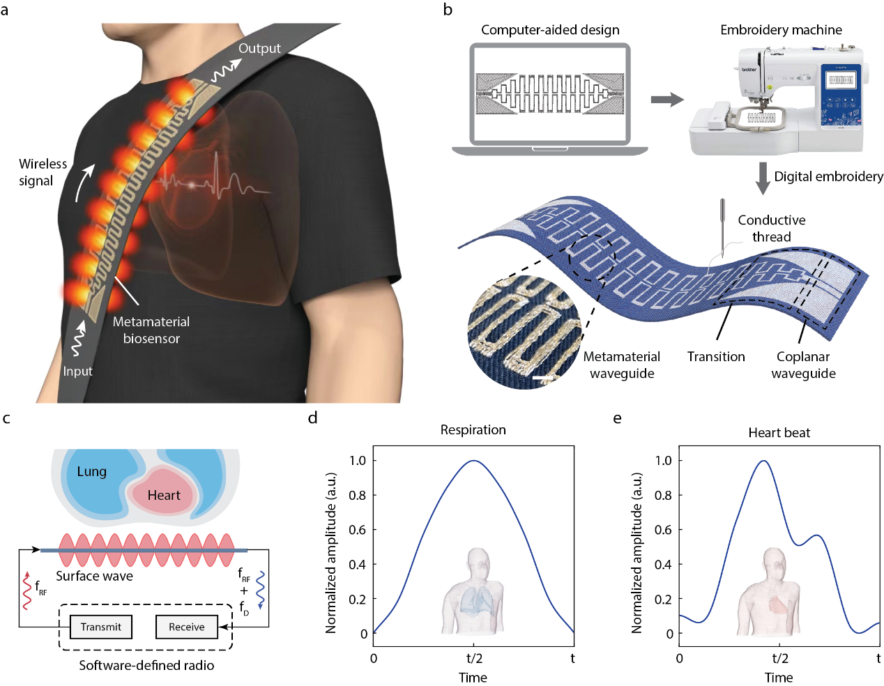 电磁超表面传感器采用人工表面等离激元结构,支持高压缩表面电磁波的传输,相较于传统无线传感技术,能实现更高灵敏度和抗干扰能力的局部传感(图1)。通过开发的数字刺绣技术,该传感器可被无缝集成到安全带中,通过引导并增强无线信号与身体的交互作用,能透过衣物捕捉人体细微的生理运动。