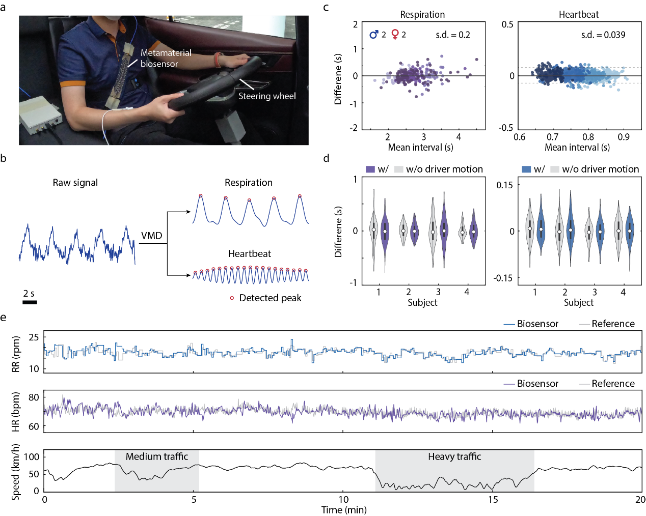 超表面传感器的连续生理监测能力在实际车载环境中得到了进一步验证(图4)。尽管车辆环境中存在较大的振动噪声干扰,但是该超表面传感器仍能有效采集到各类生理信号。