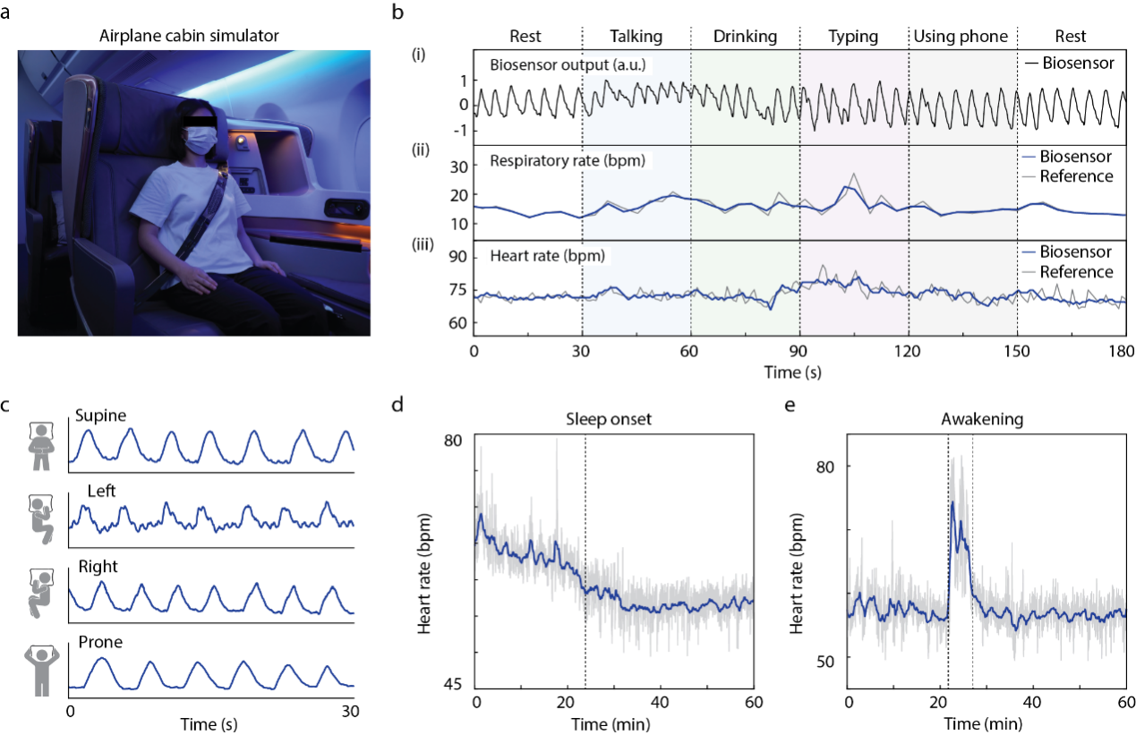 使用该超表面传感器,可在飞机机舱中进行日常活动的生理监测(图3)。在有身体运动和背景噪声干扰的动态环境中,传感器仍能可靠地捕捉到呼吸和心跳信号。同时针对飞行中睡眠监测的需求,团队验证了该传感器在不同的身体姿态中捕捉生理信号的能力,包括仰卧、俯卧和左右侧卧,结果显示中位心跳间隔(IBI)误差仅为15毫秒。