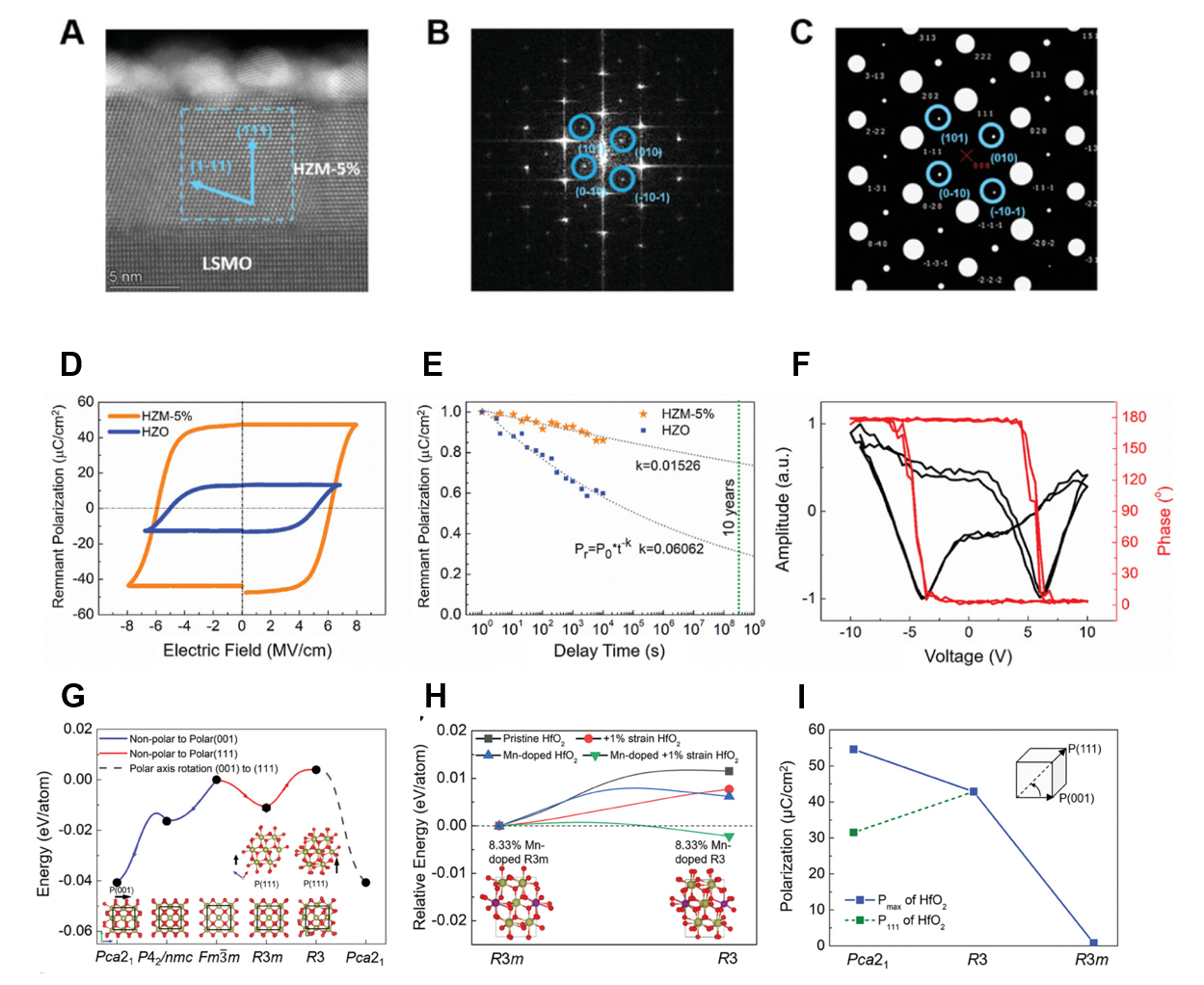 (A)5%Mn掺杂HZO外延薄膜扫描透射电子显微镜原子相及其对应的(B)快速傅里叶变化(FFT)衍射图。(C)R3相FFT模拟衍射图。(D,E,F)5%Mn掺杂HZO外延薄膜铁电剩余极化,保持性以及压电力响应显微镜局部翻转结果。(G)对称性从高至低的氧化铪基铁电相路径演化-能量图。(H)Mn掺杂含量以及面外应力对菱方相基态的选择计算。(I)三种铁电相的极轴变化以及在面外方向的极化投影大小
