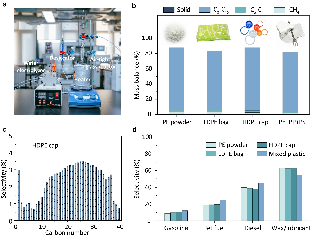 清华新闻网12月10日电 废弃塑料的资源化利用是推进绿色低碳循环发展的重要举措。聚乙烯是全球需求量最多的通用塑料,每年消费量超过1亿吨。氢解可将聚乙烯选择性转化为高值液体燃料和化学品,但往往需要在较高的氢气压力下进行。