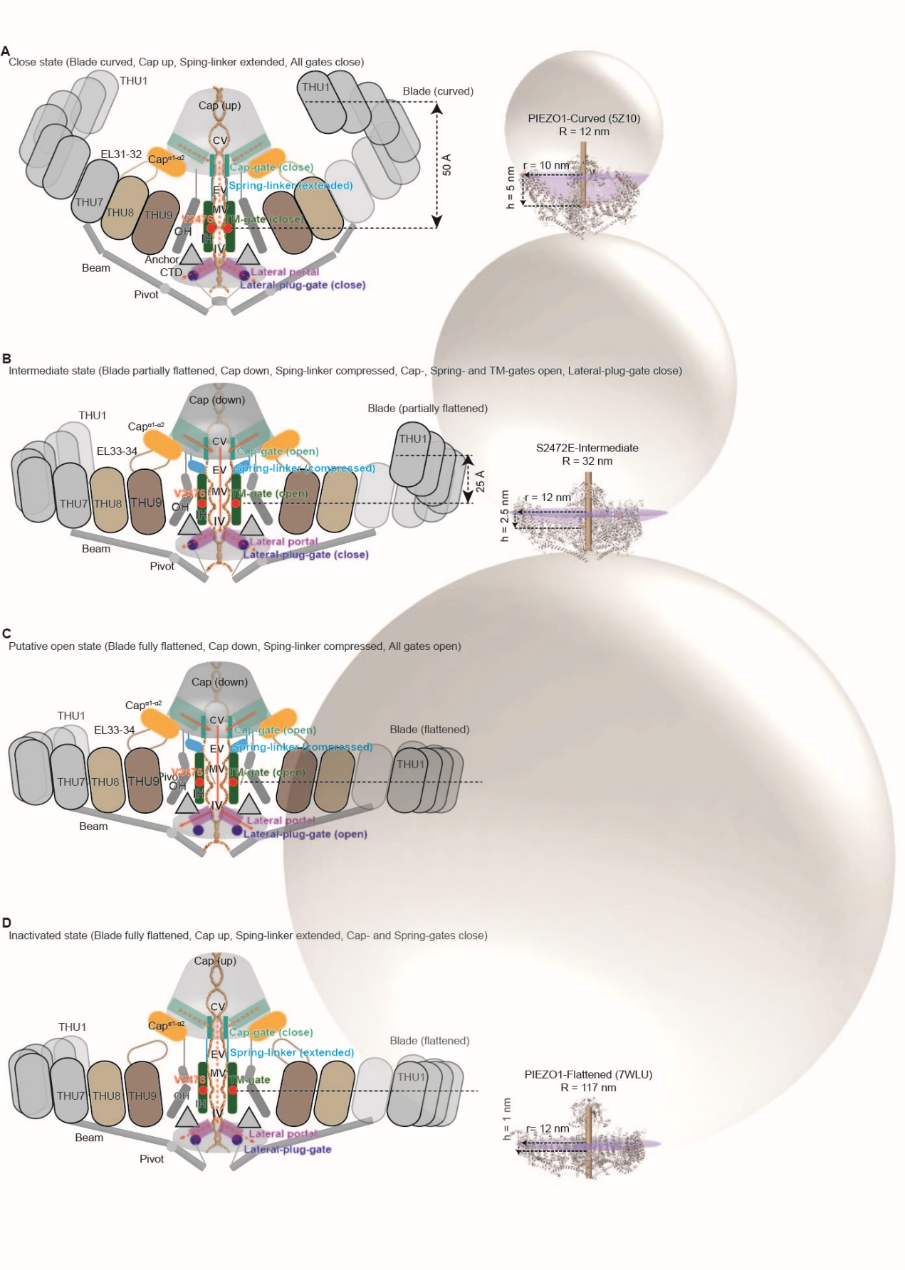 图1.PIEZO1关闭、中间开放与失活的结构机制示意图