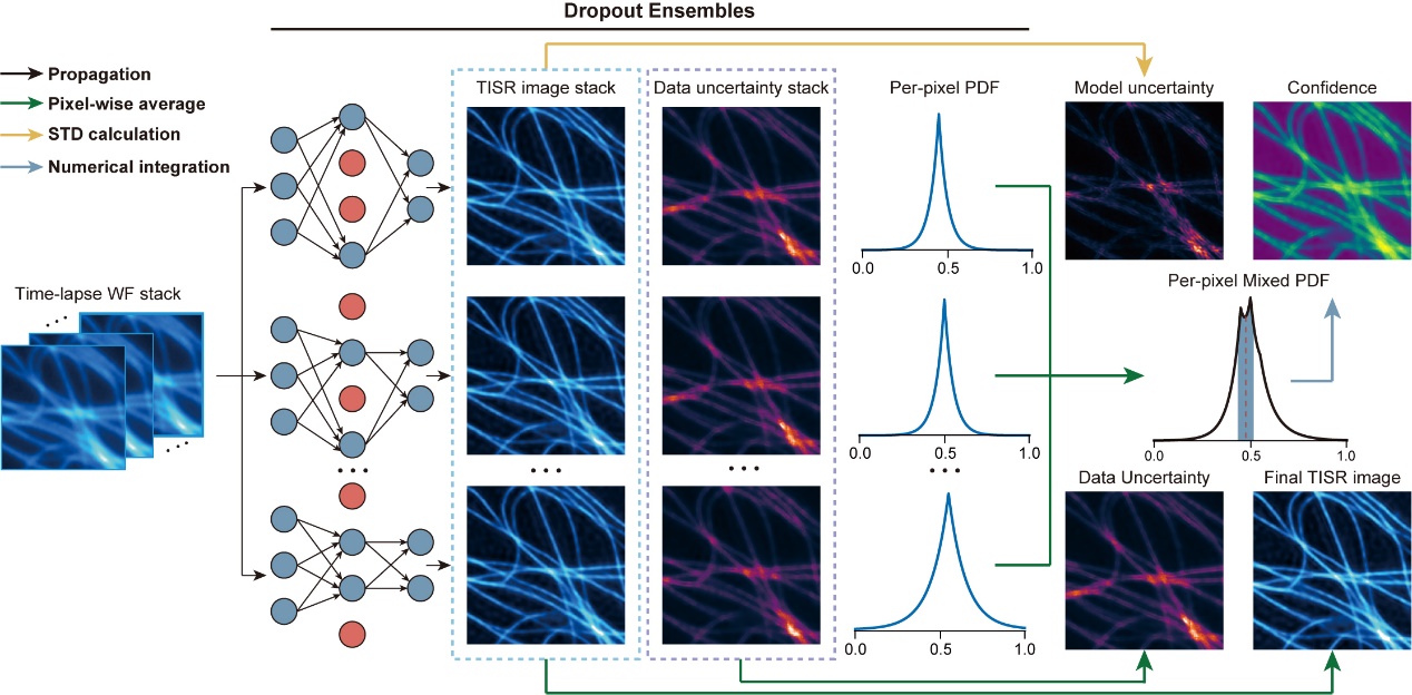 清华新闻网1月30日电 高信噪比、高分辨率的显微图像总是蕴含着更丰富、更准确的信息,帮助我们以更加精确的视角认知微观世界。然而,受多种生物物理、生物化学、物理光学因素(如荧光标记浓度、探针亮度、光毒性、光漂白、光子噪声等)的限制,传统超分辨显微成像技术在提升空间分辨率的同时,往往会牺牲成像时程、速度等其他重要性能。针对这一问题,beat365英国官方网站戴琼海/李栋合作团队曾于2021年提出傅里叶注意力超分辨方法(DFCAN),仅使用单张低分辨率图像即可实现高保真超分辨预测。此后,多种单张显微图像超分辨(Single image super-resolution,SISR)模型被提出,用以拓展活体超分辨显微成像的性能。然而,这些SISR模型在实际应用于活体显微成像实验(通常表现为时序数据)时,往往存在两个重要局限:第一,SISR模型无法捕捉相邻帧之间的时间相关性,可能产生时间不一致的推理结果;第二,当前SISR方法缺乏对输出结果的准确置信度评估,因而生物学家无法判断其产生的结果是否可信。