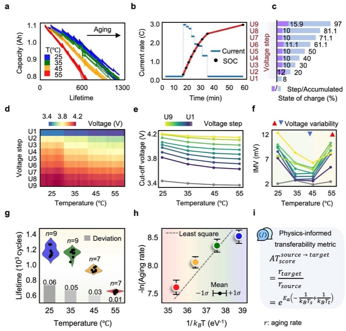 本研究所提出的物理信息学习模型分为三个步骤:首先,用可解释特征工程表达电池多维电化学过程;其次,用早期电化学过程数据推演后期尚未建立的电化学状态;最后,用推演后的电化学状态进行电池衰减曲线预测。实验采用多源域自适应设置(25℃和55℃数据可用)并在35℃和45℃温度下预测,利用早期循环数据即可实现准确的全寿命衰减曲线预测。