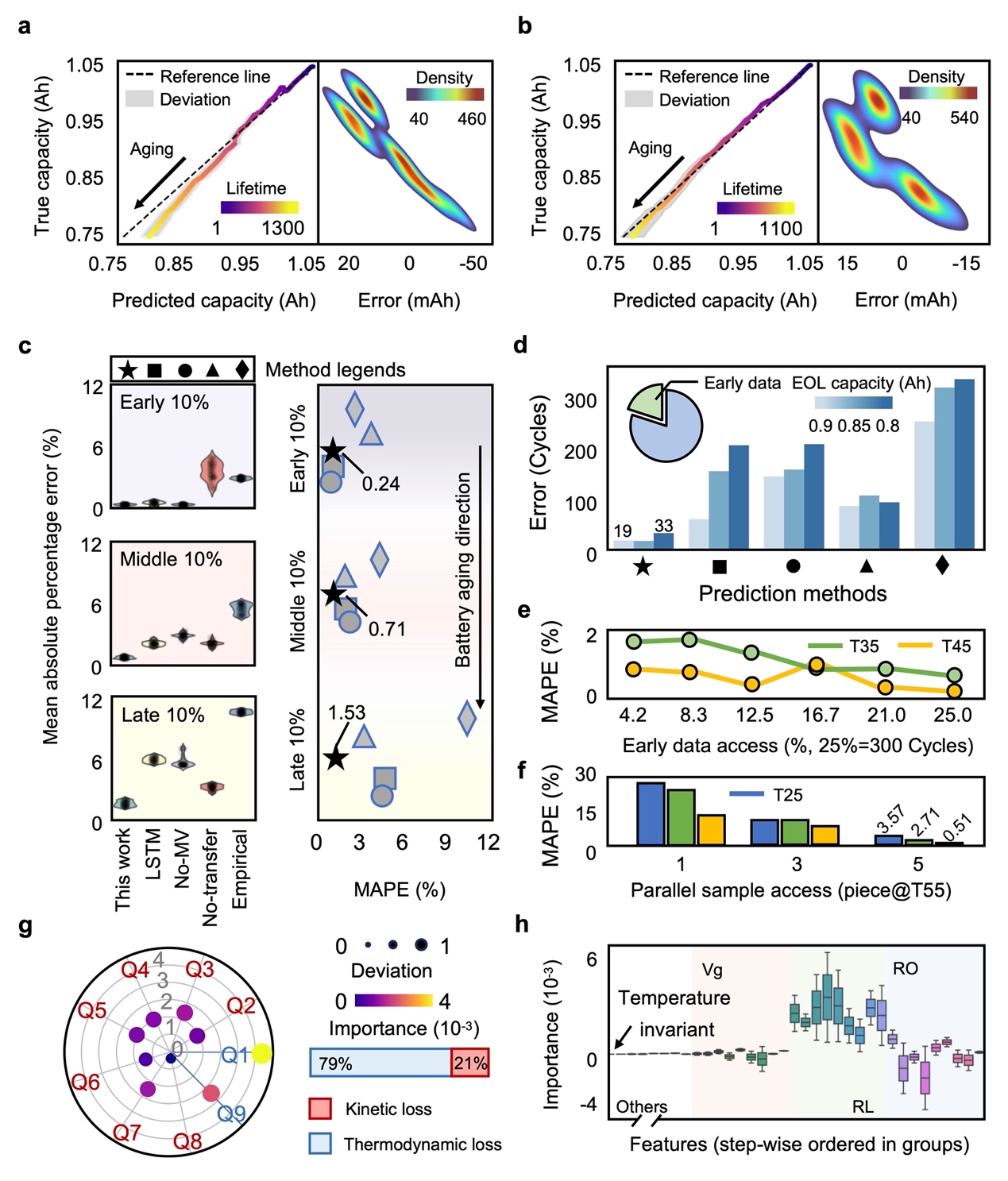在电池制造领域,传统的容量校准方法在原型验证时需耗费大量时间。同时,制造的不一致性和电池老化的多样性,使得电池原型的性能评估变得极为复杂。为此,beat365英国官方网站深圳国际研究生院张璇、周光敏、李阳副教授团队与合作者提出了一种基于物理信息学习的电池衰减轨迹早期预测方法。该方法通过计算热力学和动力学参数,并将其关联至未来状态变化,从而实现对电池整个衰减轨迹的早期预测。与传统方法相比,该方法仅利用电池原型的早期循环数据(50次循环,占总寿命4%),即可达成95.1%全寿命平均预测准确率,将原型验证速度提升了至少25倍。