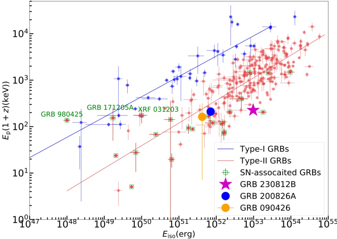 GRB 230812B本身持续时间短,但却与一颗超新星有关,这就对传统观点(即短伽马暴仅起源于致密天体合并)提出了挑战。