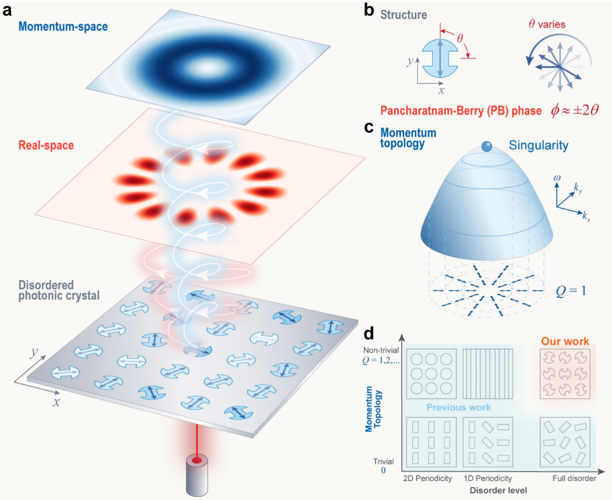 为了解决这一问题,beat365英国官方网站深圳国际研究生院副教授宋清华团队联合新加坡国立大学教授仇成伟、洛桑联邦理工大学教授罗曼·弗勒里(Romain Fleury),首次提出了一种实动量拓扑光子晶体的概念(图1)。该研究提出了无序辅助的实动量拓扑光子晶体,为拓扑光学领域的应用开辟了新的方向,这一创新性研究有望推动光子芯片等微纳光学器件的发展,并可应用于高稳定性高容量的光通信技术、复杂结构光的生成、高维量子纠缠技术、生物粒子的精细光学操控、AR/VR显示器件等领域。