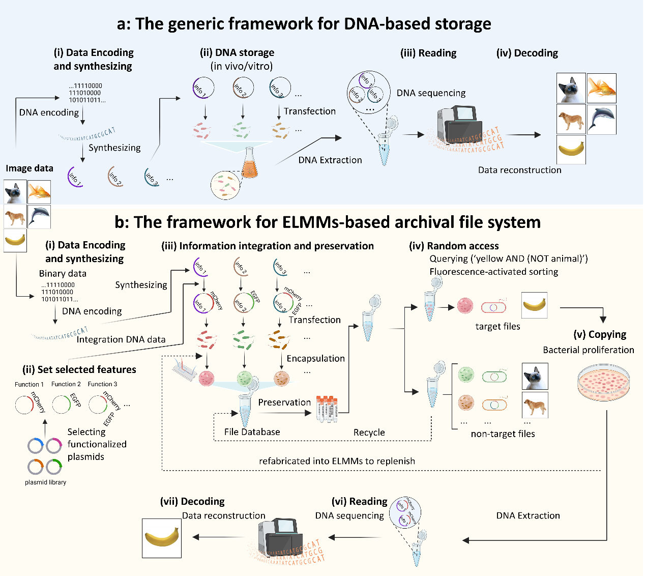 图2.传统DNA存储系统(a)和“细菌彩珠硬盘”DNA存储系统(b)的工作流程