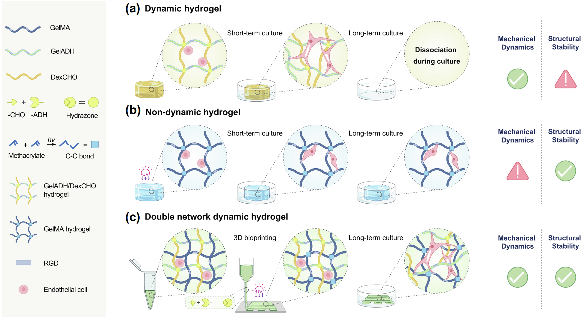 清华新闻网3月5日电 生物组织的生长是一个动态过程,在工程化组织/器官构建中,如何构建适配的三维动态微环境是一个关键问题。已有研究表明,负载细胞的水凝胶的基质动态性有助于血管形态发生,对于构筑活性组织的“生命线”具有重要意义。然而,常见的动态水凝胶基质受限于可逆交联解离或细胞介导的降解,通常在体外培养过程中存在力学不稳定性,几天以后即出现结构坍塌降解,难以支持长期培养,阻碍了其在组织器官构建和生物制造方面的应用。
