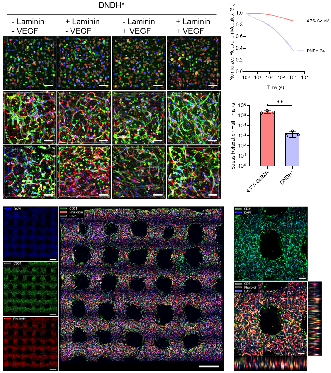 图2.双网络动态水凝胶(DNDH)体系通过基质动态性促进血管形态发生过程。同时该体系支持生物三维打印及培养中的稳定性,以得到类血管化组织结构