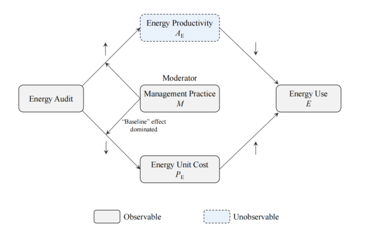 研究团队选取我国山东省48家制造业企业开展随机干预实验,针对变压器、照明、压缩机等设备使用提出节能措施建议,采用双重差分方法分析了能源审计对于用电水平和成本的影响,并通过量化企业的结构化管理水平,进一步分析了管理水平与节能建议采纳和干预效果之间的关系。图1展示了能源审计干预的潜在影响以及各变量之间的联系,其中,“基线效应”是指管理实践薄弱的企业更容易从干预中获取增益的节能措施信息,从而实现更大幅度的单位用能成本下降。