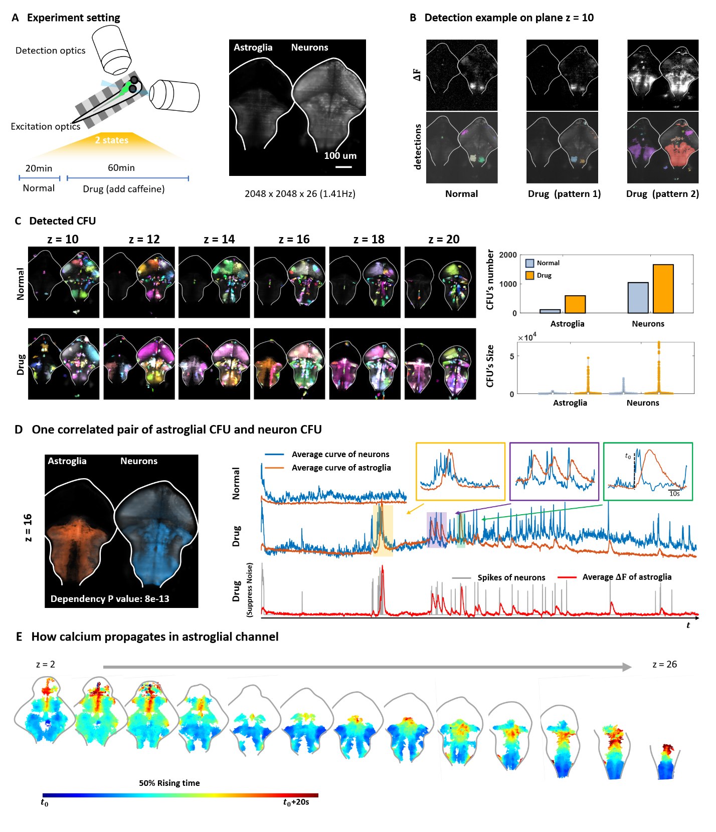 咖啡因作为中枢神经系统兴奋剂和腺苷受体阻滞剂/拮抗剂发挥作用,影响神经元和神经胶质细胞的功能,并在一定程度上调节大脑的内部环境。检测结果显示了两种状态下的代表性信号。在药物状态下,其中一种模式反映了正常状态,仅显示神经元信号。这种模式可能反映了由于游泳行为引起的信号激活。相反,在药物状态下的另一种模式显示了星形胶质细胞钙信号,通常伴随着更大的神经元信号。这种独特的大脑活动模式表明,由于咖啡因的加入,整个大脑的动力学发生了变化。