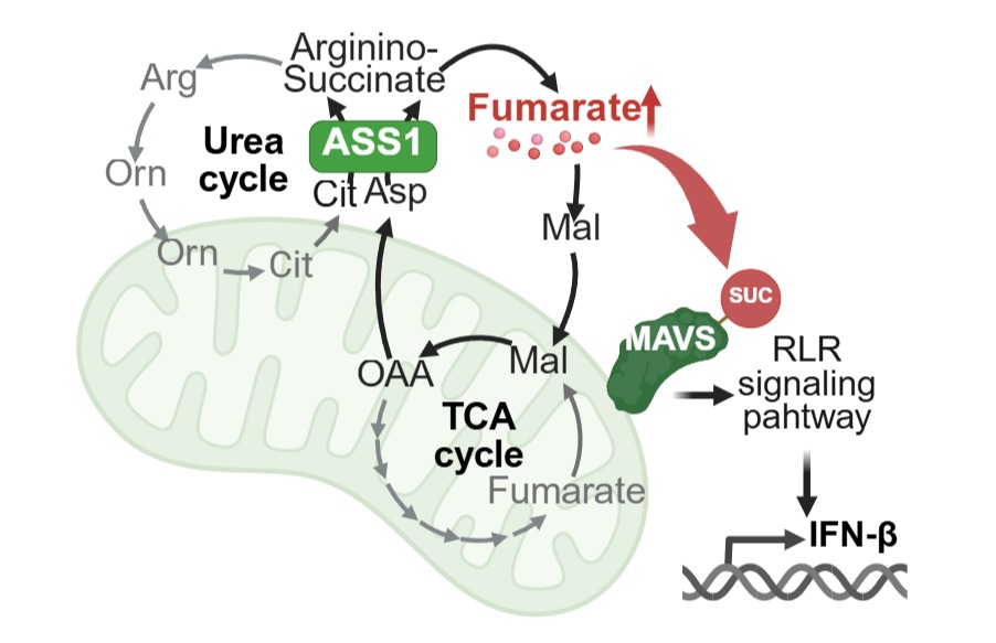 此前,江鹏课题组发现了尿素循环代谢异常决定肿瘤和巨噬细胞的命运,并系统研究了TCA cycle代谢在抗肿瘤和免疫调控中的作用。研究人员发现,病毒感染早期可促使巨噬细胞中的尿素循环与三羧酸(TCA)循环发生协同重编程,形成一个闭环的代谢通路,称为天冬氨酸–精氨基代琥珀酸(Aspartate–Argininosuccinate, AAS)旁路。研究通过RNA测序、非靶向代谢组学分析和同位素示踪等手段,证实该旁路由胞质中的精氨基代琥珀酸合成酶(ASS1)驱动,进而促进延胡索酸(fumarate)生成,并增强炎症信号传导。功能实验表明,敲除ASS1会显著降低细胞内延胡索酸水平,抑制干扰素-β(IFN-β)的表达,并削弱线粒体呼吸功能。更为关键的是,病毒感染或外源性补充延胡索酸酯可通过促进线粒体抗病毒信号蛋白(MAVS)琥珀酸化,激活视黄酸诱导基因-I样受体(RIG-I-like receptor)信号通路,从而增强IFN-β的表达。这一机制不仅在囊泡性口炎病毒(VSV)感染模型中得到验证,也同样适用于仙台病毒和甲型流感病毒等其他病毒感染。此外,感染埃博拉病毒患者的单核细胞呈现ASS1表达上调。ASS1缺失的小鼠在VSV感染后则显现出干扰素应答受损的表型。