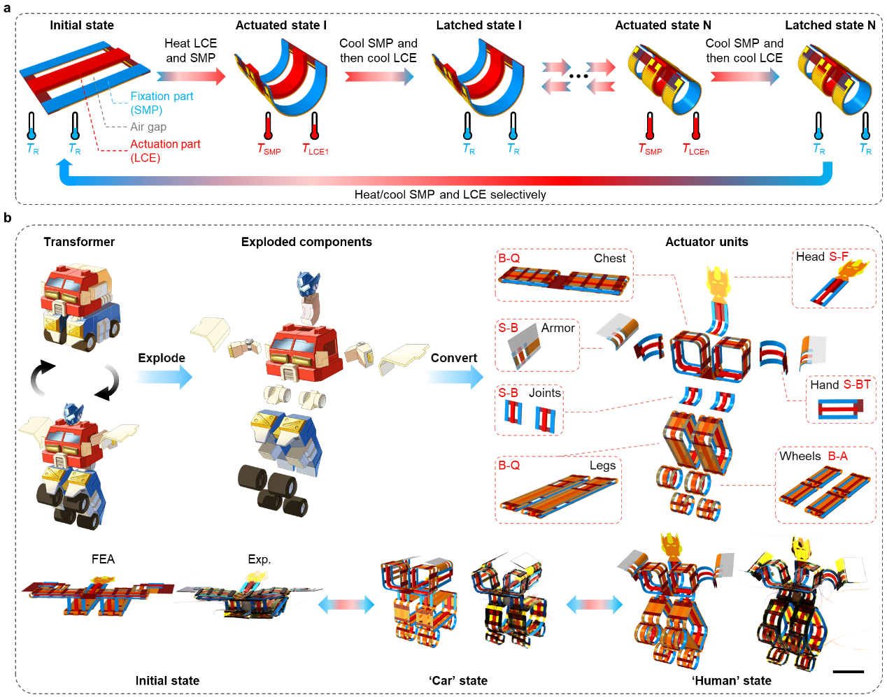 图1.具有连续变形和锁定能力的小尺度驱动器。(a)为驱动器的变形和锁定示意图;(b)为基于“搭积木”设计策略的“变形金刚”驱动器。(比例尺:10mm)