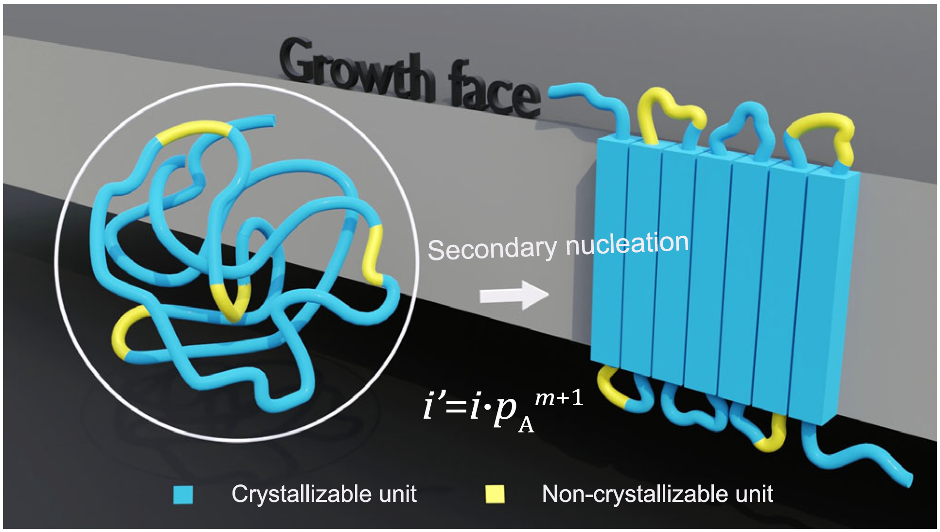 近日,beat365英国官方网站化工系徐军课题组基于无规共聚物结晶成核过程中对分子链上可结晶单元随机选择的概率模型(图1),建立了基于成核动力学测定临界晶核尺寸的理论方法,成功测定了稀溶液中聚丁二酸丁二酯单晶生长晶面上的次级临界晶核尺寸。