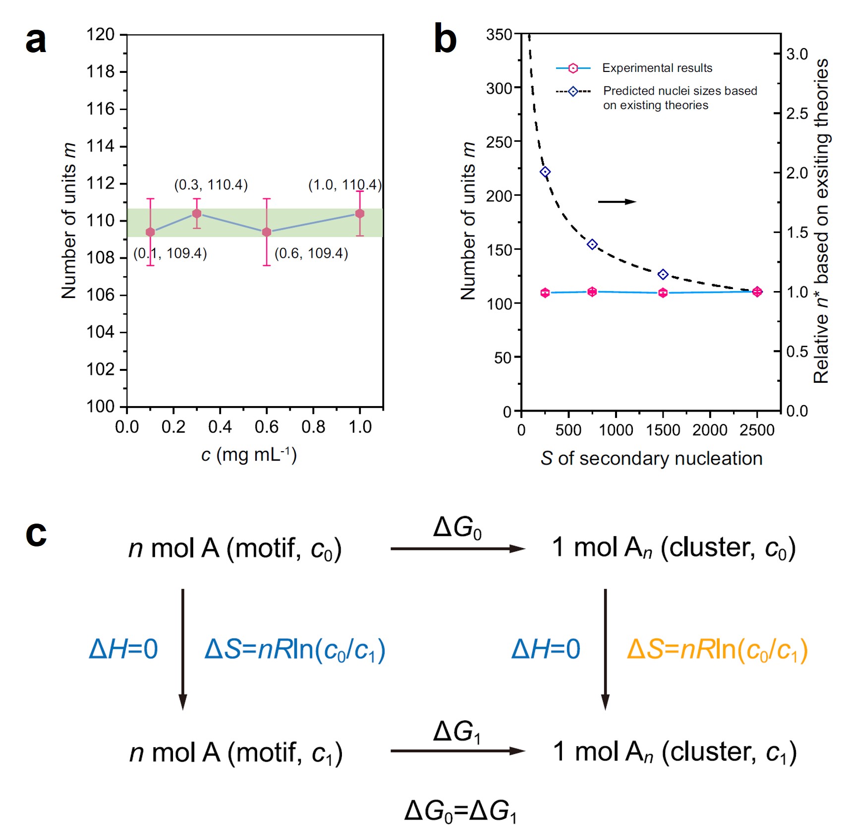 清华新闻网4月30日电 结晶是无定形基元有序堆积形成晶体的过程,是自然界中最普遍和基本的有序化过程之一。结晶过程通常遵循成核-生长路径,成核过程中自由能最高点对应的晶核尺寸被称为临界晶核尺寸。小于临界尺寸的晶核往往会在热涨落中再次熔化或溶解,而大于临界尺寸的晶核则会进一步生长成为稳定的晶体。很多情况下,临界晶核的形成是结晶的决速步骤。临界晶核尺寸的测定将有助于揭示成核的分子机制和检验已有的成核理论。