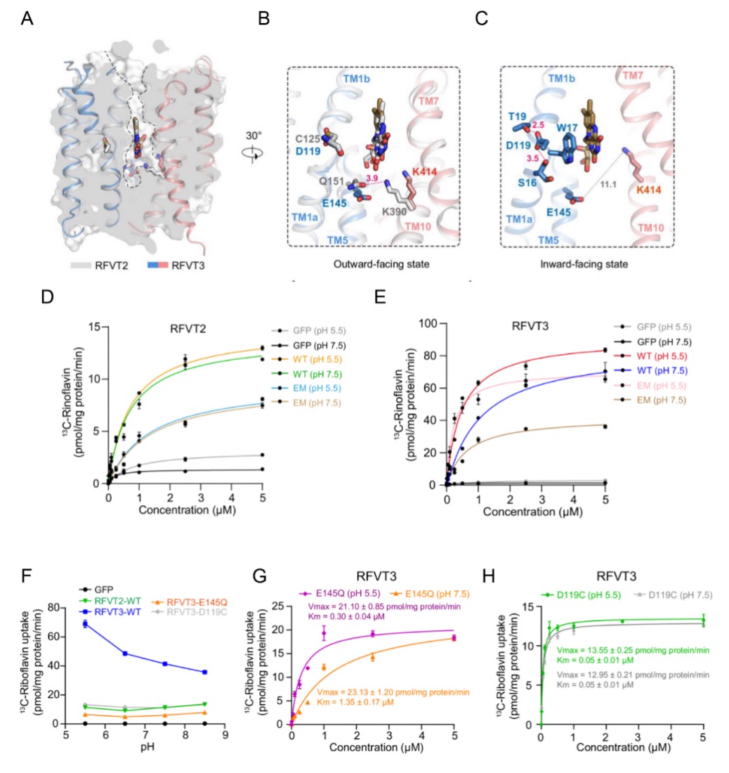 研究团队首先对RFVT2和RFVT3的功能特性进行了深入研究,发现它们虽对核黄素具有相似的特异性,但pH依赖性存在明显差异。为了进一步探究其结构基础,研究团队创新性地利用GFP和纳米抗体作为标记,成功解析了RFVT2处于外向封闭状态、RFVT3处于内向开放状态时与核黄素复合物的高分辨率冷冻电镜结构。通过结构分析和定点突变实验,明确了核黄素在转运蛋白中的结合位点及关键相互作用残基,还发现了RFVT3中两个酸性残基D119和E145决定其pH 依赖性活性的重要机制。