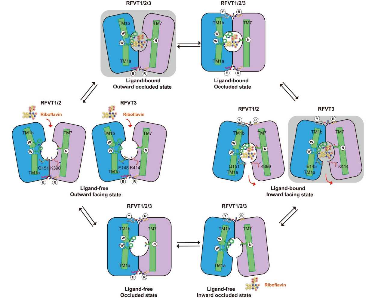 核黄素(维生素B2)作为许多酶的关键辅助因子前体,在细胞生长和功能中发挥着不可或缺的作用。人体无法自身合成核黄素,其摄取、分布和代谢依赖于三种核黄素转运蛋白(RFVT1-3)。然而,科学界对于这些转运蛋白如何识别和转运核黄素,以及RFVT3在低pH下活性增强的机制此前并不清楚。