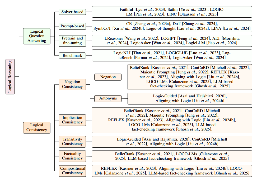 论文系统调研了该领域最前沿的研究方法与评测基准,围绕“逻辑问答”和“逻辑一致性”两个关键科学问题,建立了完整的分类体系,对前沿研究方法进行了系统归纳与概述,同时整理了该领域常用的公开基准数据集与评估指标,并探讨了未来值得关注的重要研究方向。