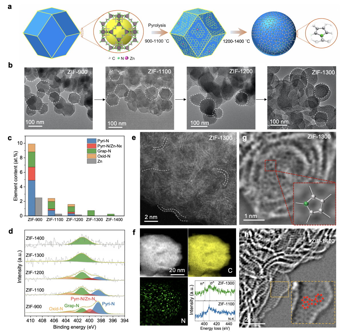对此,研究团队采用ZIF作为前驱体,在高温热处理下通过愈合锌高温挥发产生的空位缺陷,实现了五元环石墨氮的高选择性合成,其石墨氮的相对比例接近100%。利用球差矫正扫描透射电子显微镜(STEM)积分差分相位衬度成像(iDPC)的高信噪比特性、结合X-射线光电子能谱(XPS)和电子能量损失谱(EELS)分析,在原子尺度上揭示了其五元环石墨氮结构(图1)。结合多种谱学方法进一步揭示了高温热解过程中这种五元环石墨氮的微观形成机制(图2):即Zn原子在900–1100˚C热处理时从Zn-N4平面挥发形成空位;Zn空位在更高的温度下(1300˚C)发生愈合,形成含有五元环石墨氮的球面石墨层,导致材料发生球形化;继续提高温度至1400˚C时,石墨氮的含量则显著降低。