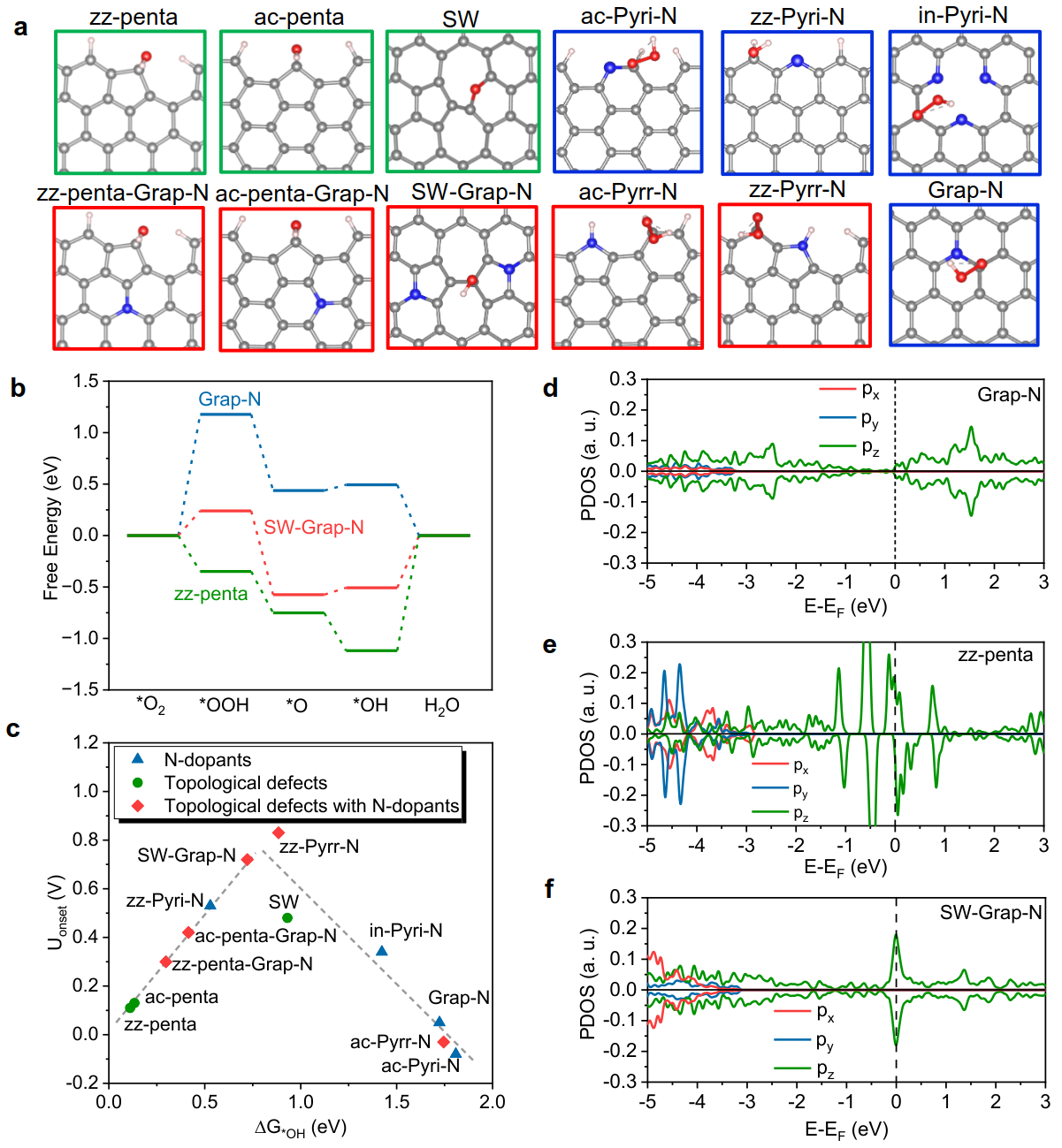 密度泛函理论(DFT)计算进一步表明(图5),五元环等拓扑缺陷与*OH中间体的结合能整体偏强,而传统的六元环石墨氮则又与*OH中间体结合偏弱;当石墨氮与五元环缺陷相结合时,费米能级附近的态密度得到优化,从而获得相对较合适的ORR中间体结合能,提高了四电子ORR的催化活性。