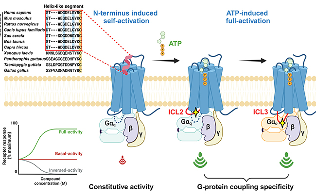 图1.P2Y2R自激活及G蛋白选择机制