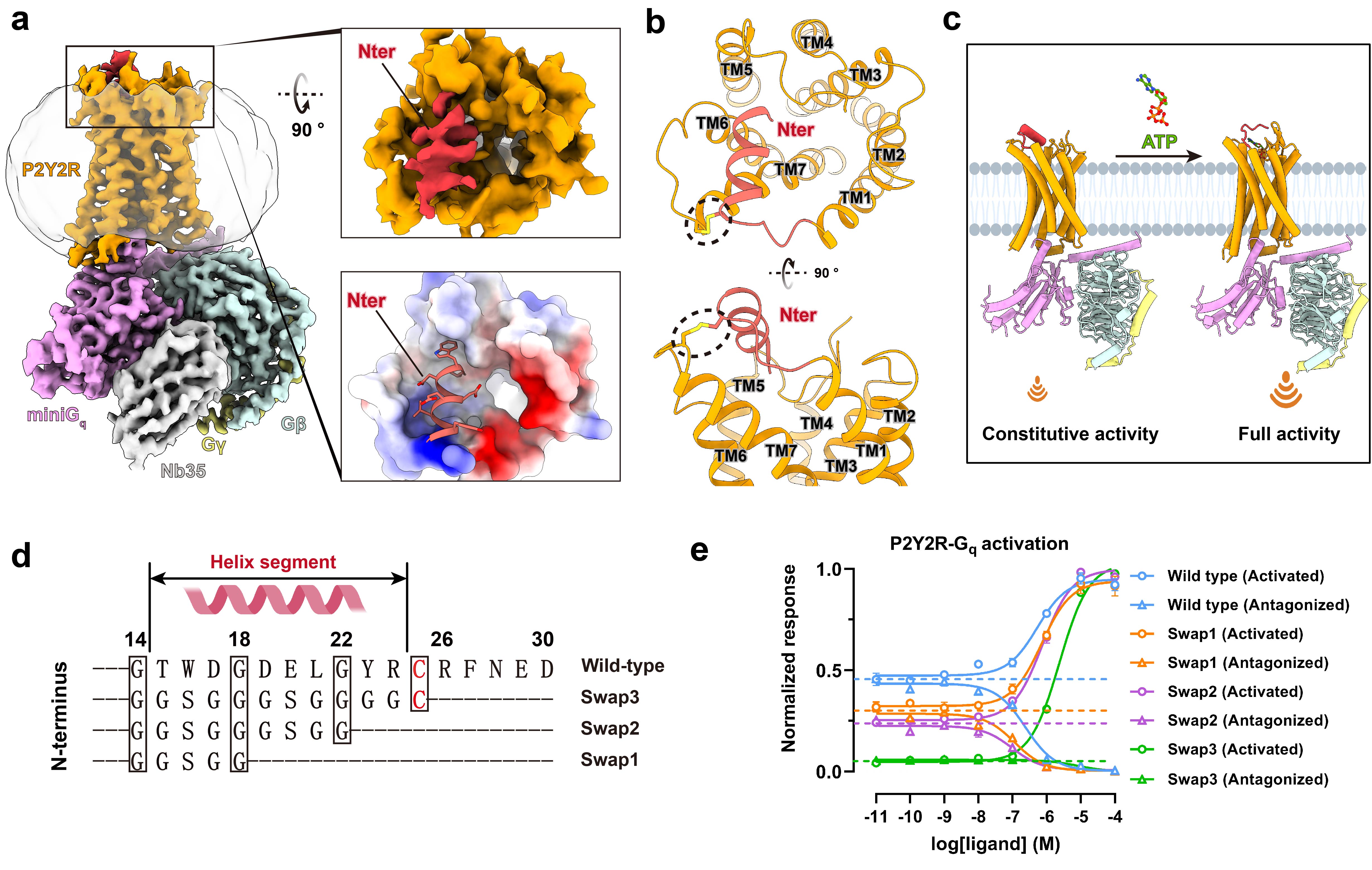 图2.ATP-P2Y2R-Gq, ATP-P2Y2R-Go和 UTP-P2Y4R-Gq复合物的冷冻电镜结构