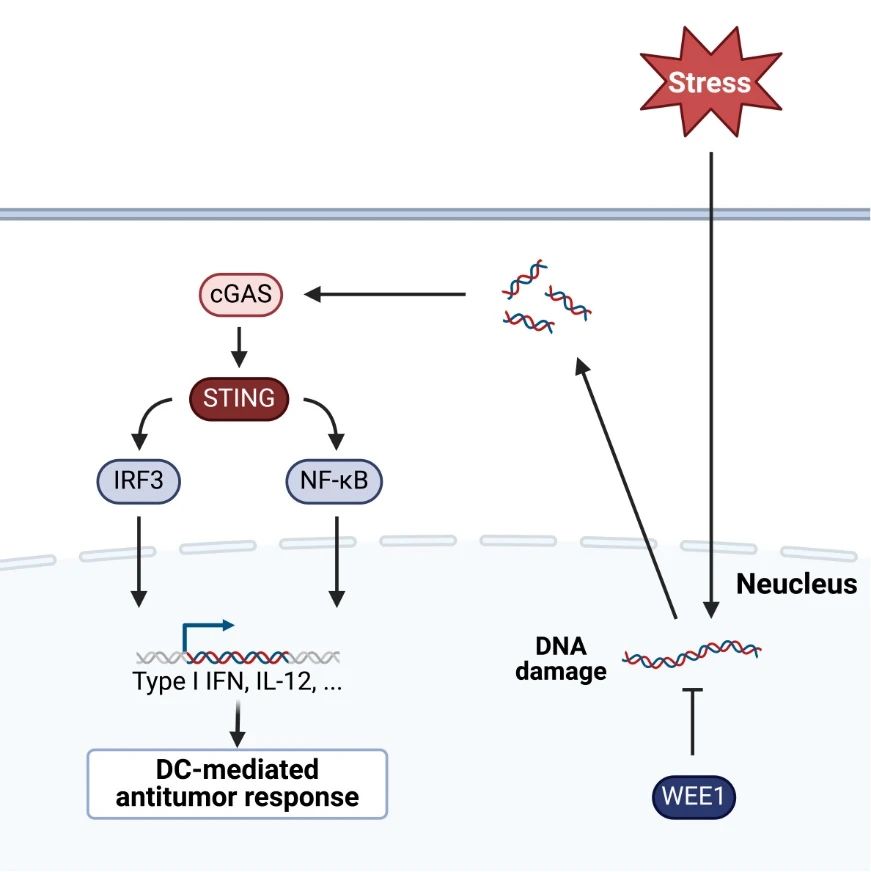 在肿瘤组织中,树突状细胞发生DNA损伤,并通过激活cGAS/STING信号通路增强其抗肿瘤功能。阻断WEE1介导的DNA损伤修复途径可提升DC的抗肿瘤活性